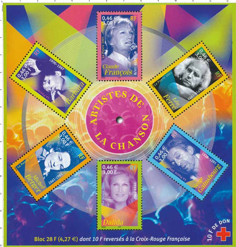 | Commentaire | Description synthétique du visuel du timbre : Les 6 timbres sont disposés dans le bloc de façon circulaire et épousent les contours d’un CD. Le fond du bloc évoque la foule et l’ambiance des concerts. Ambiance accentuée par la présence de faisceaux de projecteurs dont le principe est également repris sur chacun des visuels de timbres. |
