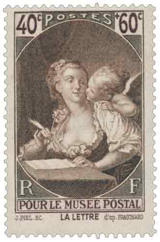 | Commentaire | Fragonard est un grand virtuose de la peinture, admiré par certains impressionnistes comme Renoir ou Monet. Son œuvre, très riche, comporte les inévitables scènes mythologiques, encore présentes à la fin du XVIIIe siècle (et même au XIXe), mais aussi beaucoup de scènes de genre, selon la terminologie de l’époque. Il s’agit souvent de représentations plus ou moins sensuelles de la relation amoureuse. Fragonard a également peint quelques portraits et des paysages inspirés des peintres hollandais. Remarque : le TP ne représente pas l'œuvre "La Lettre", mais la gravure dérivée de "L'Inspiration Favorable" de Jean Honoré FRAGONARD (1732 - 1806). Gravure à l'eau-forte de Louis Michel HALBOU (1730-1810). Le timbre semi-postal à 40 centimes brun-lilas et brun, dessiné et gravé par Jules Piel d'après une scène galante de La Lettre ou L'Inspiration favorable de Jean-Honoré Fragonard illustrant l'acte épistolaire dans l'esprit rococo du XVIIIe siècle, est émis le 6 juillet 1939 au profit de la création du Musée postal projetée depuis 1936. Imprimé en taille-douce rotative par feuilles de 25, dentelé 13, il porte une surtaxe de 60 centimes reversée à la Caisse d'amortissement pour le musée et sert aux imprimés de deuxième échelon ou aux cartes de visite. |