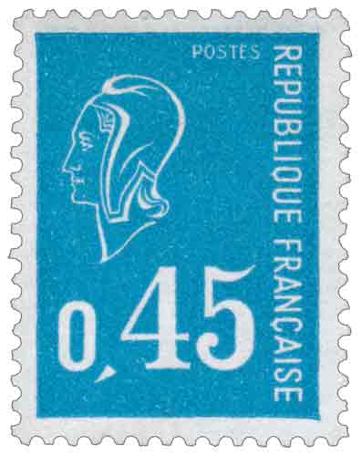| Commentaire | Nota : les timbres imprimés en typographie ne sont pas revêtus de la signature du dessinateur ni du graveur Le timbre-poste français de type Marianne de Béquet à 0,45 franc bleu, émis en 1971, s’inscrit dans la longue tradition des figurines d’usage courant représentant la République française, destinées à accompagner la vie postale quotidienne sur une durée étendue. Mis en vente générale le 8 février 1971 après une vente anticipée le 6 février à Paris, ce timbre appartient à la série dite « Marianne de Béquet », conçue pour succéder aux types précédents tout en réaffirmant la continuité symbolique de Marianne comme allégorie républicaine. Utilisé pour l’affranchissement du pli intérieur non urgent de 20 à 50 grammes, correspondant au deuxième échelon de poids, il répond précisément aux besoins tarifaires en vigueur au début des années 1970 en France. Imprimé en typographie, technique traditionnelle encore largement employée pour les timbres d’usage courant à cette période, il se distingue par un format vertical réduit et une présentation volontairement sobre, adaptée à une production massive en feuilles de cent exemplaires. Le dessin de Pierre Béquet propose un profil féminin épuré, coiffé du bonnet phrygien, renouant avec une iconographie républicaine lisible et accessible, tout en s’inscrivant dans une modernité graphique marquée par la simplicité du trait. Cette interprétation se situe dans la filiation directe des différentes Marianne apparues depuis la Libération, après les types Cérès, Mouchon, Merson, Semeuse ou encore Iris, et illustre la capacité de l’administration postale française à renouveler régulièrement ses figurines sans rompre avec l’héritage symbolique. Une particularité connue de cette émission réside dans la distinction entre timbres typographiés et gravés de la même série, identifiable notamment par la présence ou l’absence de la signature de Pierre Béquet sur la figurine, détail recherché par les collectionneurs spécialisés. Article rédigé pour WikiTimbres |