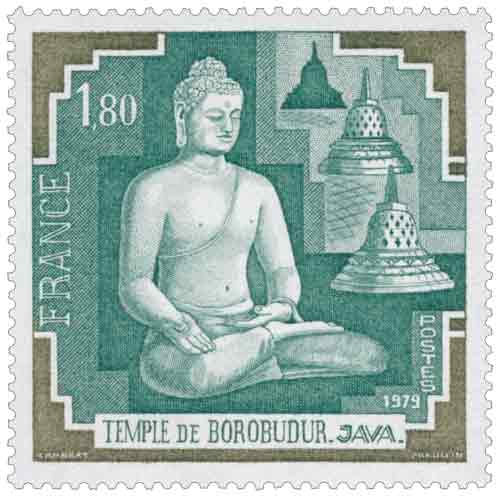 | Commentaire | Ce timbre s’inscrit dans la politique culturelle et patrimoniale de la Poste française de la fin des années 1970, qui accorde une place croissante aux grandes civilisations et aux monuments majeurs de l’humanité. Le choix du temple de Borobudur, situé au cœur de l’île de Java en Indonésie, traduit une volonté d’ouverture internationale et de valorisation des hauts lieux spirituels et artistiques de l’Asie. Édifié entre le IXᵉ siècle et le milieu du IXᵉ siècle par la dynastie Sailendra, Borobudur est un immense monument bouddhique mahāyāna conçu comme une montagne sacrée, symbole du cheminement spirituel menant à l’éveil. La composition de ce timbre met en évidence une représentation sculptée du Bouddha Ratnasambhava, reconnaissable à son attitude méditative et à la varada mudrā, geste du don et de la charité, inscrivant clairement l’image dans la tradition iconographique indienne transmise et réinterprétée par l’art javanais. Le traitement graphique privilégie la lisibilité des volumes et la sérénité des formes, en cohérence avec la dimension contemplative du sujet, tout en évoquant la monumentalité du site sans chercher à en reproduire l’architecture complète. Par cette émission, la Poste française dépasse le cadre strict des réalisations nationales pour inscrire les timbres de France dans une démarche universelle, où le timbre devient vecteur de connaissance et de dialogue culturel. En 1979, ce choix résonne également avec l’intérêt croissant porté à la sauvegarde du patrimoine mondial, Borobudur faisant alors l’objet d’importants travaux de restauration soutenus par la communauté internationale. Article rédigé pour WikiTimbres |