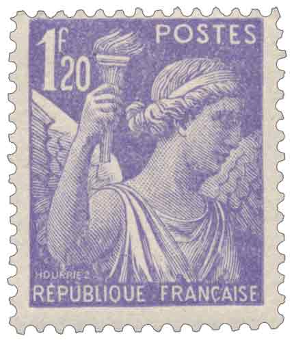| Commentaire | Le timbre Iris 1 F 20 violet appartient à la deuxième série Iris, émise à l’automne 1944 pour répondre aux besoins d’affranchissement courant dans une période de normalisation progressive des services postaux après la Libération. La figure d’Iris, messagère des dieux, est reprise ici dans une fonction strictement utilitaire, sans dimension commémorative. Dessiné et gravé par Georges Hourriez, ce timbre est imprimé en typographie, procédé robuste et bien adapté aux tirages importants. Mis en vente générale le 30 septembre 1944, il couvre une large gamme d’usages postaux intérieurs, ce qui explique un tirage élevé et une diffusion massive sur l’ensemble du territoire.