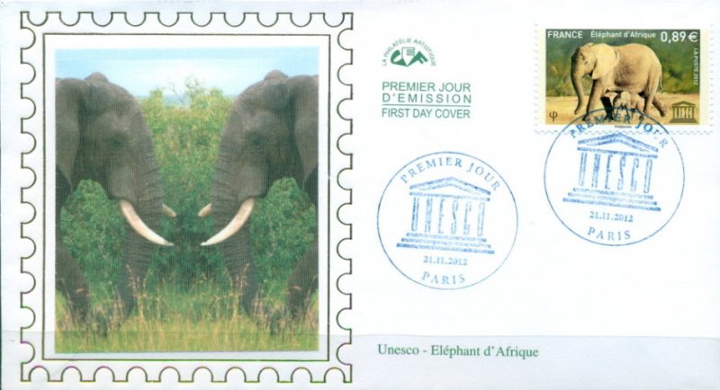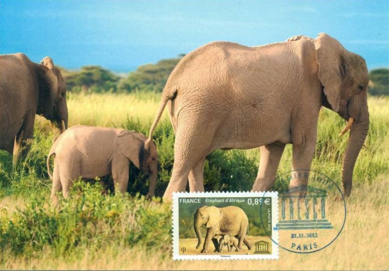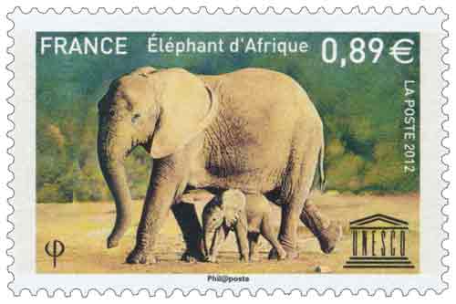 L’éléphant de savane représenté sur le 2e timbre est l’espèce africaine la plus connue. Elle est menacée de disparition : en 30 ans sa population est passée de 1 300 000 à 600 000 individus.