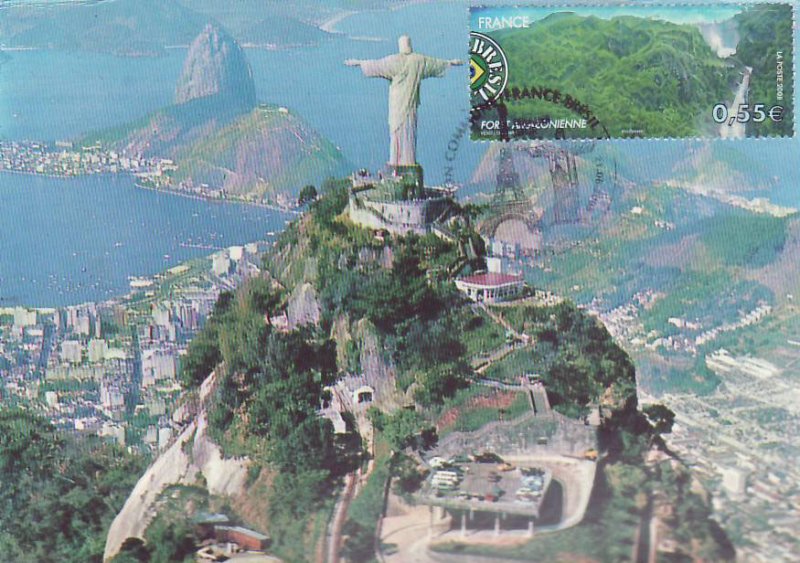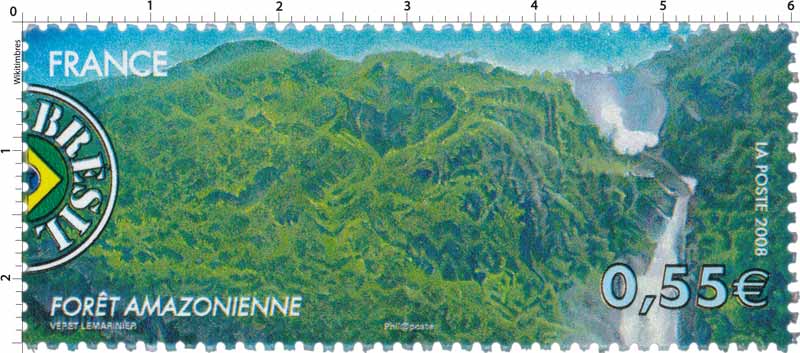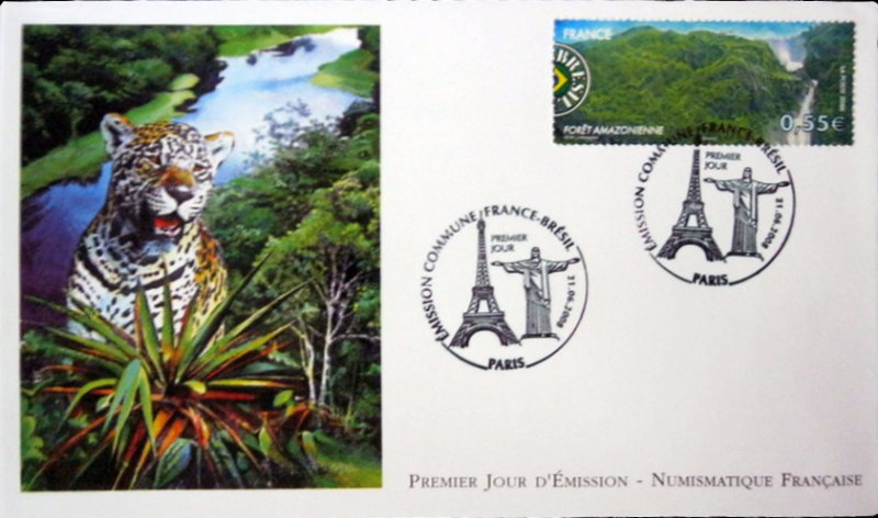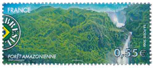 | Commentaire | Paysage de France et du Brésil. La forêt amazonienne au Brésil. La mise en vente anticipée a lieu les 21 et 22 juin au Salon du timbre, à Paris. Le timbre à date « premier jour » est dessiné par Claude Perchat qui place côte à côte la tour Eiffel et le Christ Rédempteur de Rio de Janeiro. En 2009, le timbre est élu « plus beau timbre de l'année » dans la catégorie « timbre en offset ou en héliogravure » suite à un vote des internautes, organisé par Phil@poste |