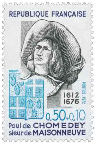 | Commentaire | Surtaxe au bénéfice de la Croix rouge Française Ce timbre-poste français émis en 1972 rend hommage à Paul de Chomedey de Maisonneuve, figure majeure de l’histoire de la Nouvelle-France et fondateur de Ville-Marie, devenue Montréal, en s’inscrivant à la fois dans la tradition des émissions commémoratives historiques et dans celle des timbres à surtaxe au profit de la Croix-Rouge française. La figurine rappelle l’« épopée mystique » qui accompagna la colonisation française du Canada au XVIIᵉ siècle, lorsque des laïcs et des religieux, animés d’un idéal spirituel et missionnaire, cherchèrent à établir une présence durable sur les rives du Saint-Laurent. Né en 1612 à Neuville-sur-Vanne, dont le blason est reproduit sur le timbre, Maisonneuve fut choisi par la Société Notre-Dame pour diriger l’entreprise de fondation d’un établissement destiné à la pacification et au peuplement du territoire. En 1642, il posa les bases de Ville-Marie sur l’île de Montréal, dans un contexte marqué par les difficultés matérielles, l’isolement et les conflits avec les Iroquois, assumant à la fois des responsabilités militaires, civiles et spirituelles. L’émission de 1972 met en valeur cette action fondatrice tout en rappelant la dimension humaine et religieuse de l’entreprise, symbolisée par la croix dressée sur le mont Royal et par la présence de figures telles que Jeanne Mance et Marguerite Bourgeoys. Sur le plan philatélique, ce timbre de 0,50 franc, majoré d’une surtaxe de 0,10 franc, répondait à l’affranchissement de la lettre jusqu’à 20 grammes pour la France métropolitaine, ce qui lui assura une large diffusion postale tout en contribuant à une œuvre de solidarité nationale. Dessiné et gravé en taille-douce par Pierre Béquet, il adopte un format vertical classique et une gamme chromatique sobre associant noir et bleus, adaptée à un portrait historique et à une évocation institutionnelle. Par cette émission, la philatélie française associe mémoire coloniale, histoire religieuse et engagement humanitaire, tout en rappelant les liens anciens et durables entre la France et le Canada francophone. Article rédigé pour WikiTimbres