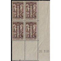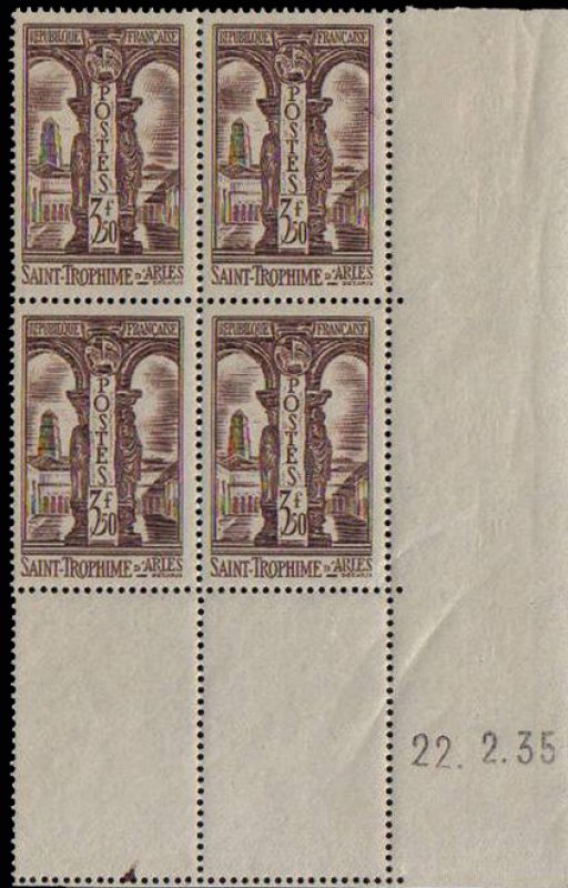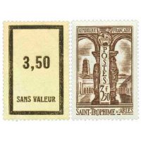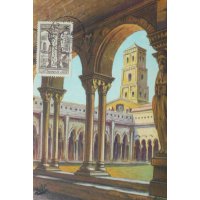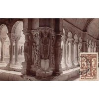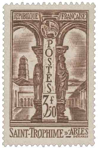 Avec ce 3 f 50 brun, Albert Decaris signe l’une de ses gravures monumentales les plus abouties des années 1930. Le cloître Saint-Trophime, chef-d’œuvre de l’art roman provençal, offre au graveur un terrain idéal pour déployer son style : perspectives profondes, alternance d’ombres puissantes et de lumière ciselée, abondance de détails sculptés. Decaris restitue avec une précision remarquable les chapiteaux romans et gothiques, ainsi que la succession des galeries qui caractérisent ce cloître si particulier, édifié entre le XIIᵉ et le XIVᵉ siècle.