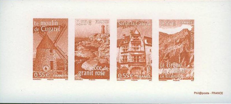 | Commentaire | BF117. Bloc de dix timbres de 0,55 euro La mise en vente anticipée du bloc a lieu dans plusieurs villes concernées par le sujet des timbres : Castelnaudary, Coulon, Honfleur, Paris, Perros-Guirec, Rigny-Ussé, Salazie, Sarlat-la-Canéda, Strasbourg et Vézelay. Le cachet premier jour représente une carte de la France métropolitaine sur laquelle figure un moulin et un clocher. |