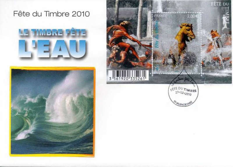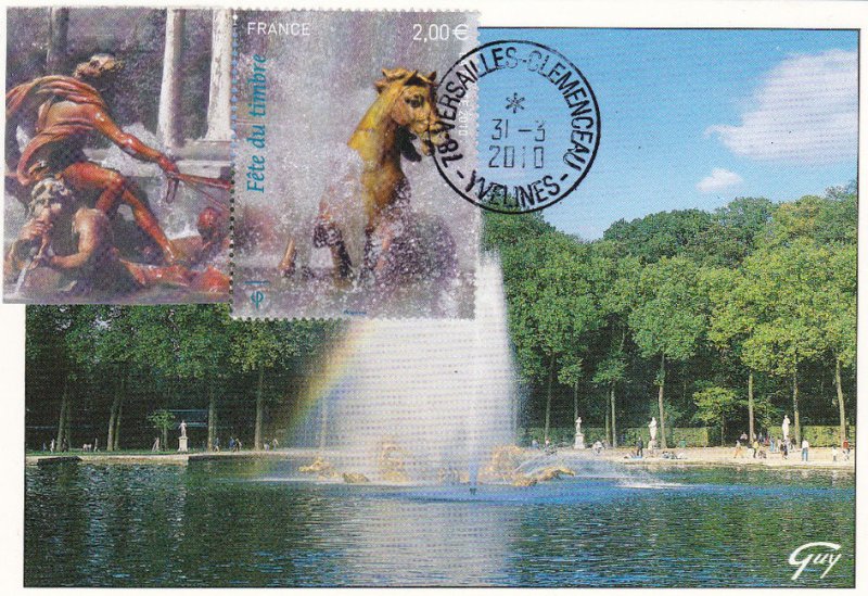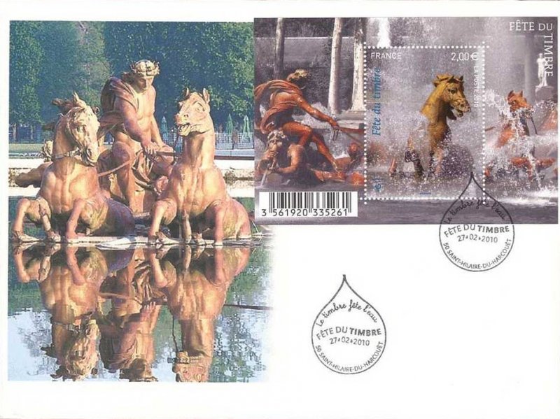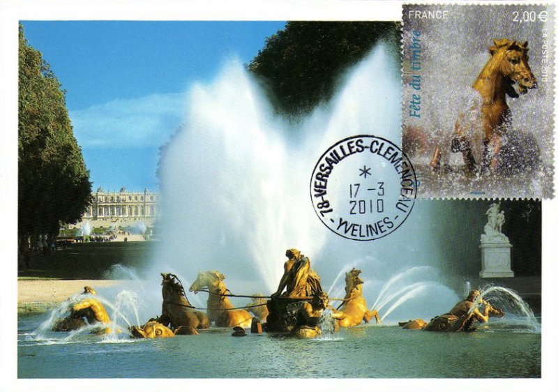 | Commentaire | La Fête du timbre 2010 se déclinera sur le thème de l’eau. L’eau jaillit pour se donner en spectacle dans les Grandes Eaux du Château de Versailles. C’est l’occasion de rappeler que l’eau, sous toutes ses formes, est un ornement prépondérant des jardins français. Le timbre-poste représente le bassin d’Apollon. Le dieu du Soleil mène, sur son char, un fougueux attelage. Ce groupe monumental, fait en plomb doré, est une œuvre de Tuby réalisée à partir d’un dessin de Le Brun. Le timbre, ainsi que la statue du fond de bloc, à gauche, sont gaufrés et vernis. |
