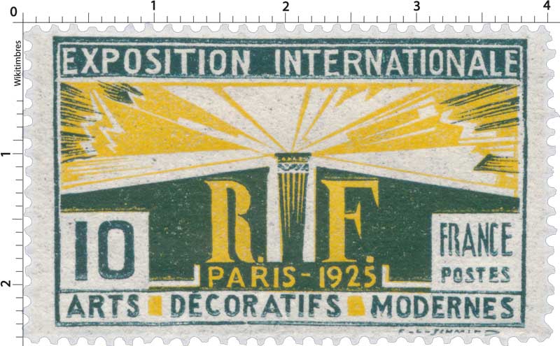 Émis le 15 juin 1925 et retiré le 31 octobre 1925, le timbre Exposition internationale des Arts décoratifs, valeur 10 centimes, accompagne l’un des événements majeurs de l’entre-deux-guerres : l’Exposition internationale des Arts décoratifs et industriels modernes de Paris, manifestation qui donnera son nom au style Art déco. Gravé et dessiné par Schmitd, le timbre adopte un grand format horizontal 40 × 24 mm (vignette 36 × 22 mm) et une dentelure 13½ × 14, imprimé en typographie en feuilles de 75. Sa composition vert-noir et jaune reflète le graphisme audacieux et les codes décoratifs de l’exposition de 1925. Installée entre les Invalides et les Grand/Petit Palais, l’exposition couvre 23 hectares et réunit les pavillons régionaux, les grandes nations invitées et les créations emblématiques des magasins parisiens (Printemps, Galeries Lafayette, Bon Marché). Véritable vitrine du modernisme français, elle marque l’apogée du premier style Art déco et consacre la place de Paris comme capitale mondiale des arts décoratifs.