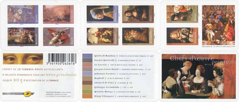 | Commentaire | Pour illustrer le carnet artistique de 2008, La Poste rend hommage aux grands peintres et chefs-d’œuvre des siècles passés. Dans ce véritable petit musée de poche, se côtoient Giotto di Bondone (Scènes de la vie de saint François, le sermon aux oiseaux