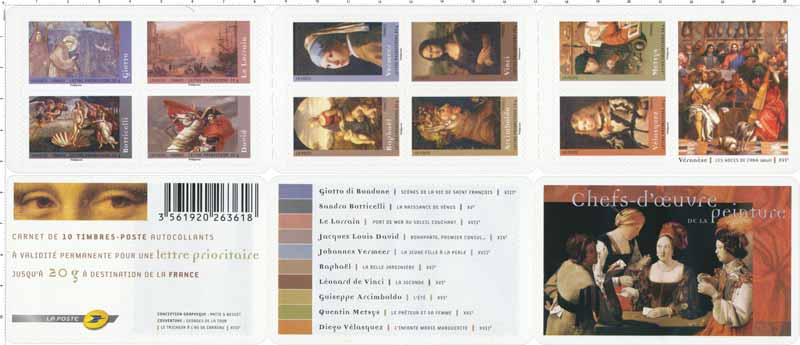 | Commentaire | Pour illustrer le carnet artistique de 2008, La Poste rend hommage aux grands peintres et chefs-d’œuvre des siècles passés. Dans ce véritable petit musée de poche, se côtoient Giotto di Bondone (Scènes de la vie de saint François, le sermon aux oiseaux