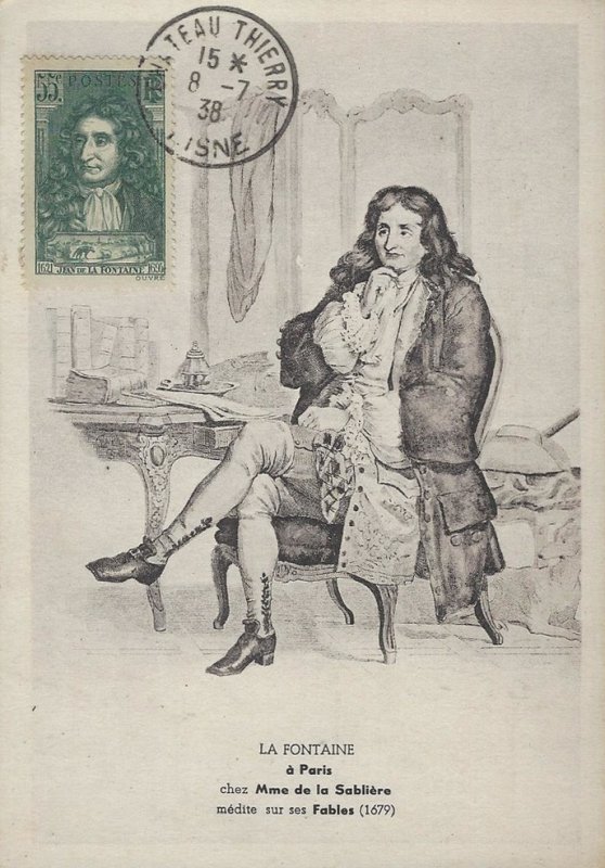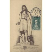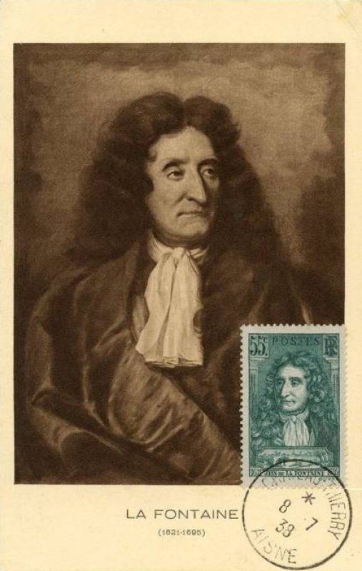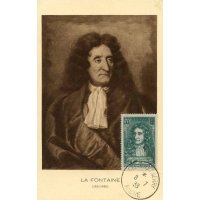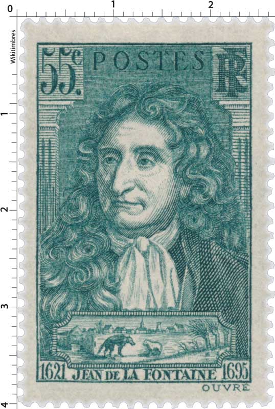 | Commentaire | Émis le 8 juillet 1938 pour le tricentenaire de sa naissance, ce timbre de 55 centimes vert commémore Jean de La Fontaine, poète né à Château-Thierry en 1621 et mort à Paris en 1695. Dessiné et gravé en taille-douce par Achille Ouvré, il est imprimé en rotatif à feuilles de 50 exemplaires. Tiré à 6 millions d'exemplaires, il affranchissait la carte postale intérieure ordinaire ou de plus de cinq mots. Le portrait de l'écrivain surmonte une vignette illustrant la fable Le Loup et l'Agneau, dont la morale « La raison du plus fort est toujours la meilleure » résume l'esprit critique et satirique des douze livres de Fables publiés entre 1668 et 1694, chefs-d'œuvre qui, sous le couvert de la fiction animalière, dépeignent les mœurs de la cour de Louis XIV et valent à leur auteur une célébrité durable auprès de tous les publics. |