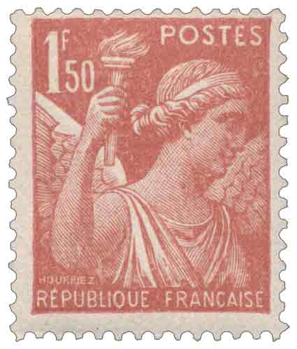 | Commentaire | Le timbre Iris 1 F 50 rouge-brun appartient à la deuxième série Iris émise en 1944, période marquée par la reprise progressive des services postaux après la Libération. Reprenant la figure d’Iris, messagère mythologique, cette valeur s’inscrit dans une logique strictement fonctionnelle d’usage courant, destinée à couvrir le tarif de la lettre simple intérieure jusqu’à 20 g ainsi que plusieurs services annexes liés au courrier recommandé et aux valeurs à recouvrer. Dessiné et gravé par Georges Hourriez, le timbre est imprimé en typographie, procédé privilégié pour les fortes cadences et les volumes élevés. Mis en vente générale le 5 septembre 1944, il connaît une diffusion massive sur l’ensemble du territoire, reflet direct de son adéquation aux besoins postaux courants de la France de l’après-guerre immédiate. |