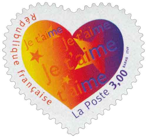 | Description | Timbres de souhaits. Timbres de Saint-Valentin Cœur avec Je t'aime et étoiles. Carnet. Adhésif. |