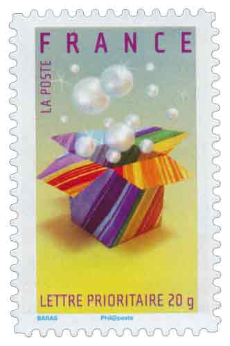 | Description | Timbres de messages. Invitation. Boîte d'où s'échappent des bulles, issus du carnet de 5 TP Merci Invitation Festif, les timbres à stickers |