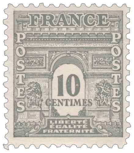 | Commentaire | Voir la vidéo "Histoires de timbres" Ce timbre gommé de France émis en 1944 appartient à la deuxième série dite du Gouvernement provisoire représentant l’Arc de Triomphe de Paris, conçue et imprimée aux États-Unis dans le contexte du débarquement allié et de l’administration postale des territoires libérés, avec une iconographie volontairement neutre et institutionnelle centrée sur un monument emblématique plutôt que sur un symbole politique, afin de pouvoir être utilisée par une autorité transitoire ; la valeur de 10 centimes gris correspond principalement à l’affranchissement des journaux, un usage peu fréquent à cette période, ce qui explique une circulation postale relativement limitée malgré un tirage important, et fait de ce timbre un témoignage philatélique direct de la transition entre l’administration postale de la Libération et le rétablissement complet de la souveraineté postale française, la série étant rapidement remplacée dès la normalisation des émissions métropolitaines à partir de 1945.