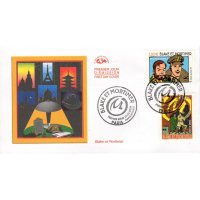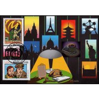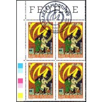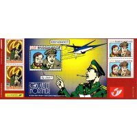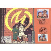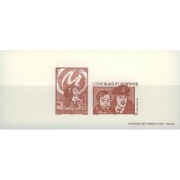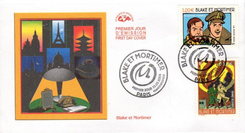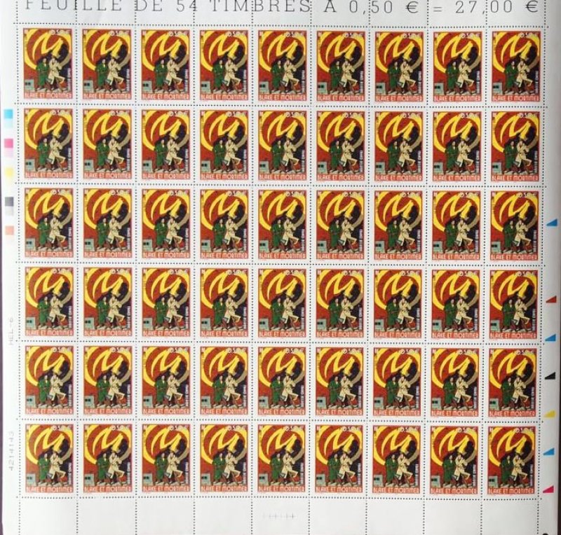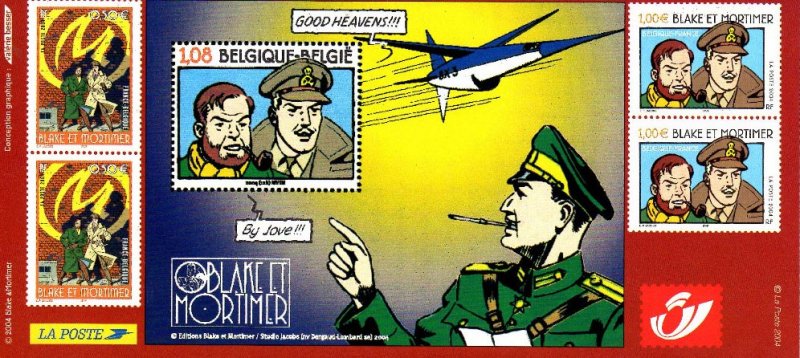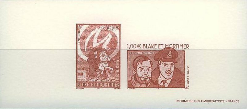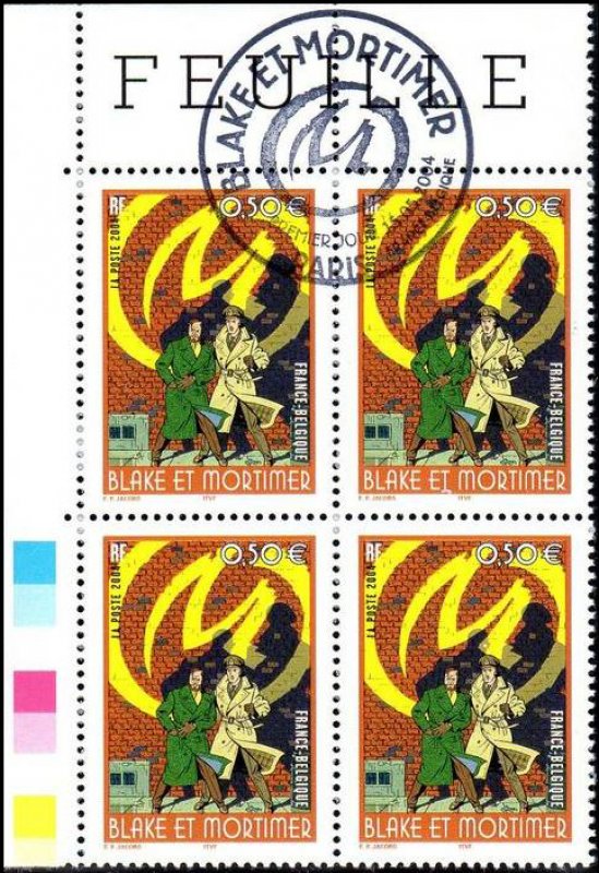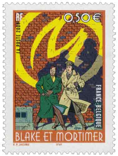 | Commentaire | Existe surchargé de bandes phosphorescentes à cheval. Existe surchargé d'une seule bande phosphorescente. Existe également non surchargé accidentellement de bandes phosphorescentes. Edgar Pierre Jacobs est né à Bruxelles le 30 mars 1904. Artiste lyrique de 1917 à 1940, il poursuit en parallèle une carrière d’illustrateur. En 1942, il est chargé de continuer « Flash Gordon » dans l’hebdomadaire « Bravo » puis crée « Rayon U », une transposition du célèbre héros. Hergé remarque ses dons de coloriste en 1943 et lui confie le remaniement de sept albums de « Tintin ». Il crée alors en 1946 dans le journal « Tintin » belge, la célèbre série des aventures de « Blake et Mortimer ». 12 albums paraîtront et parmi eux « La marque jaune » dont la couverture illustre le timbre. E.P. Jacobs meurt le 20 février 1987.Émission commune avec la Belgique. (c) 2004 Blake & Mortimer. |