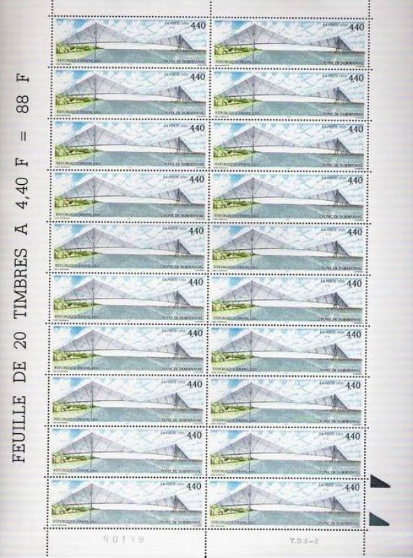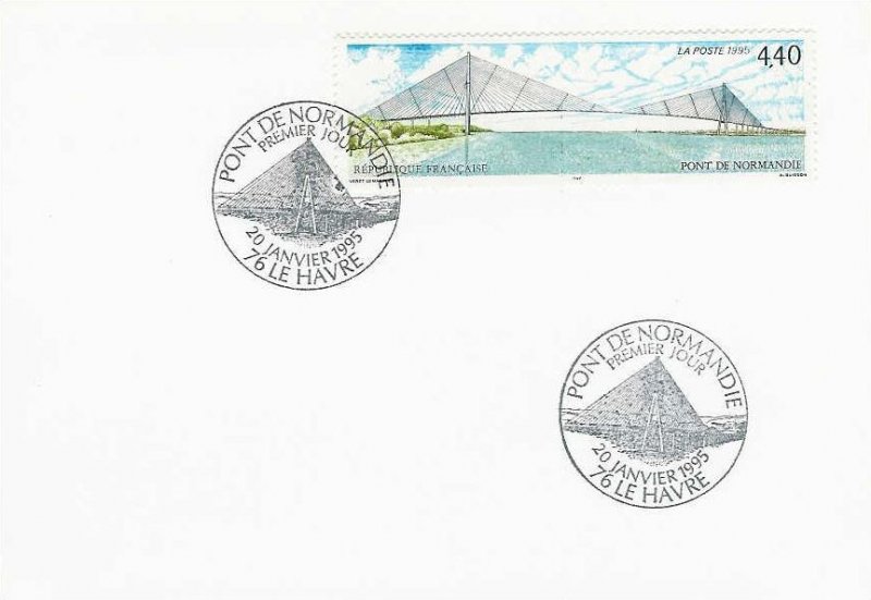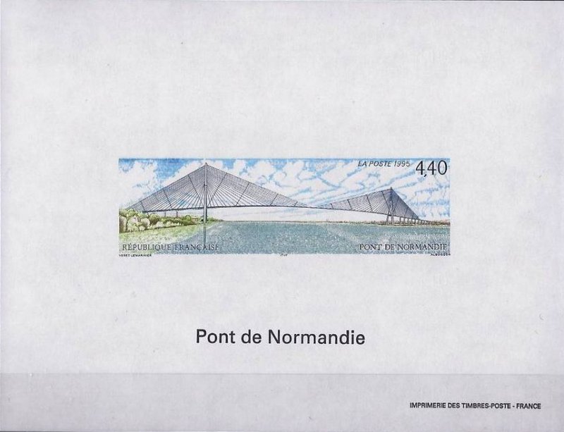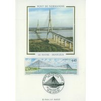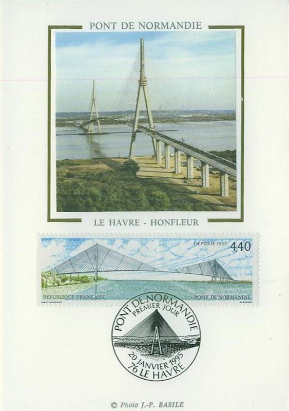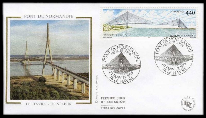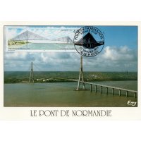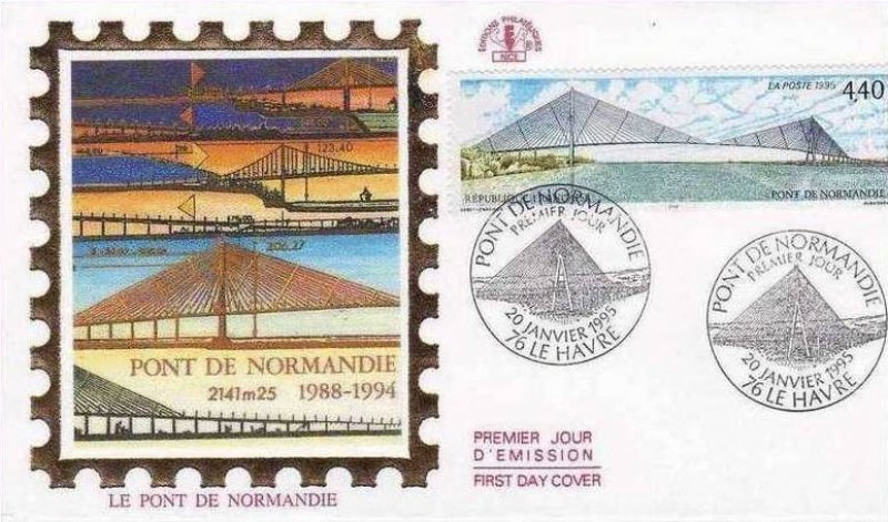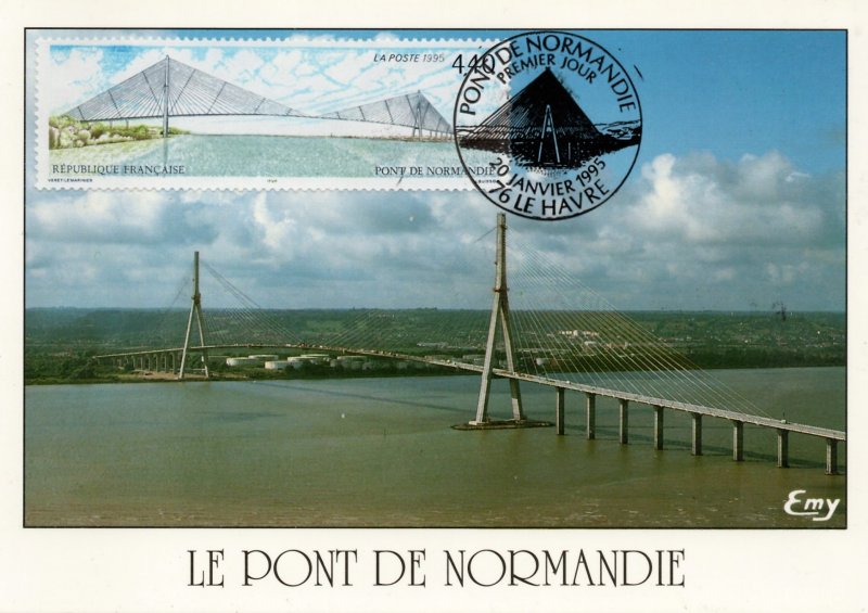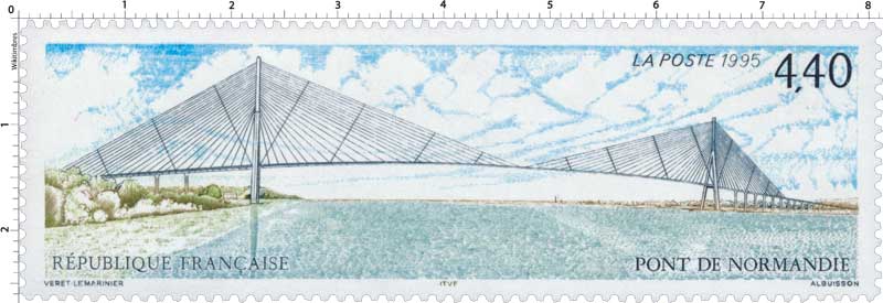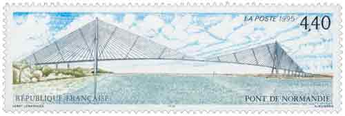 | Commentaire | Technique : construction du pont : 1989-1995 / architectes : F. Doyelle, C. Lavigne et A. Montois – ingénieurs : Michel Virlogeux (1946) Bernard Raspaud (1942) type : pont suspendu à haubans métalliques / Long. 2 141 m, portée principale : 856 m, larg. chaussée : 23,60 m (2 x 2 voies routières, 2 pistes cyclables, 2 voies piétonnes), 2 pylônes en "Y-inversé" à tête mixte de 214,77 m de haut, hauteur au-dessus de la Seine : 59,12 m 184 haubans (câbles "Freyssinet"), de Ø 16 cm et long de 95 m à 460 m, en 8 nappes latérales / matériaux : bétons armés, bétons précontraints, torons d'acier (entre 31 et 53) tablier profilé, similaire à une aile d'avion, afin de résister à des vents de plus de 250 Km/h. - L'environnement de l'ouvrage a été sauvegardé et le site valorisé. |