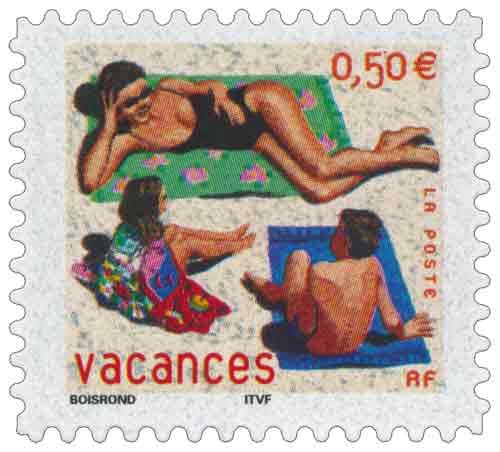 | Commentaire | Description synthétique du visuel du timbre : Les semi-permanents vacances constituent un timbre à succès faisant l’objet d’une nouvelle émission tous les ans. Une scène de vacances réalisée par François Boisrond et un format de timbre original permettent. La Poste édite en 2003 un carnet d’un format réduit et nouveau, qui plié a les dimensions d’une carte de crédit. Timbre sans millésime |
