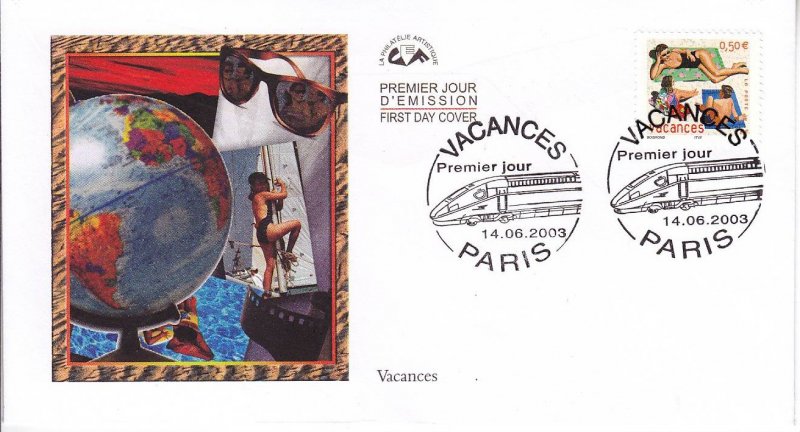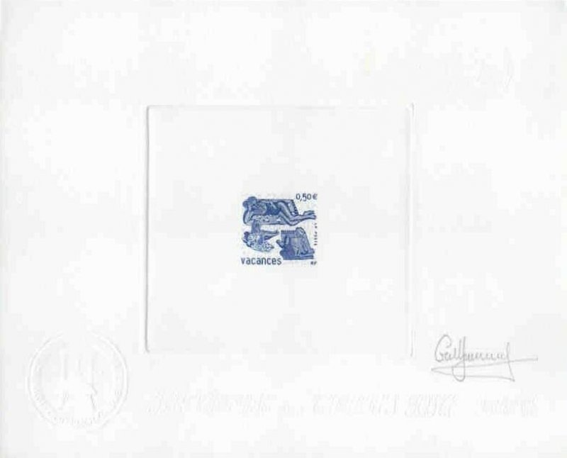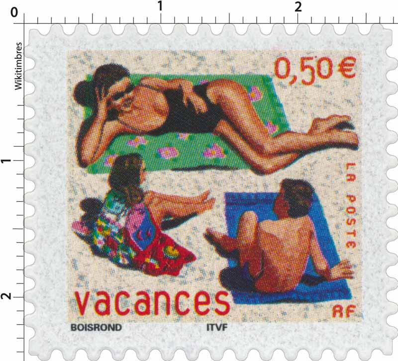 | Commentaire | Description synthétique du visuel du timbre : Les semi-permanents vacances constituent un timbre à succès faisant l’objet d’une nouvelle émission tous les ans. Une scène de vacances réalisée par François Boisrond et un format de timbre original permettent. La Poste édite en 2003 un carnet d’un format réduit et nouveau, qui plié a les dimensions d’une carte de crédit. Timbre sans millésime |
