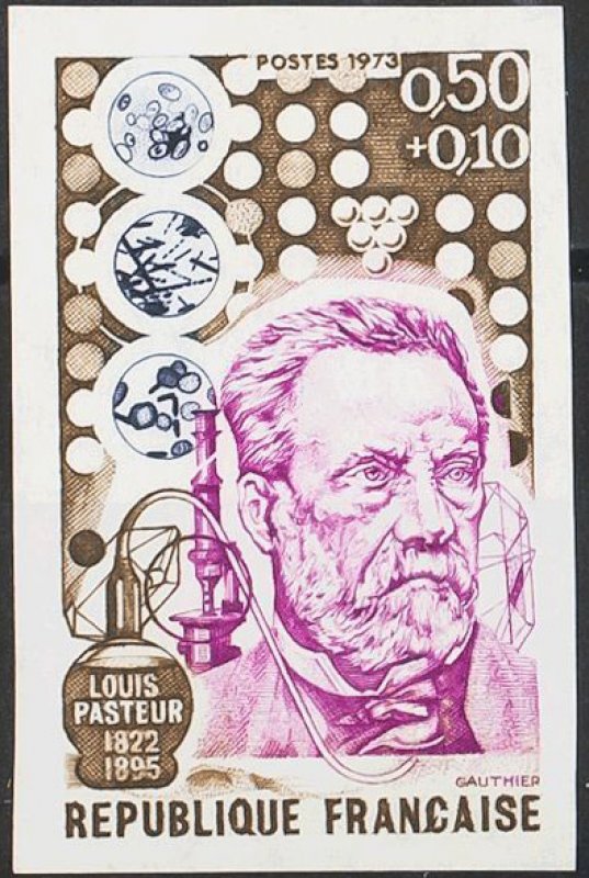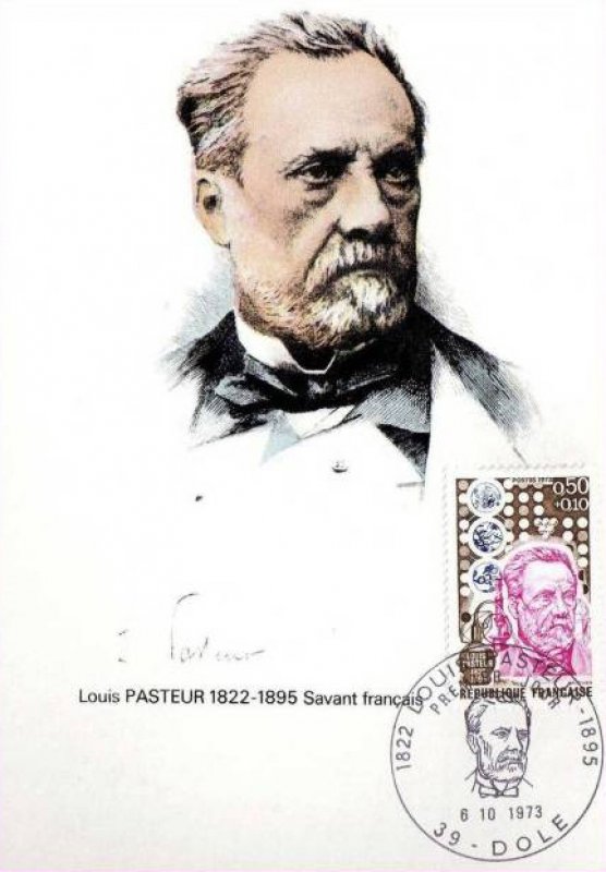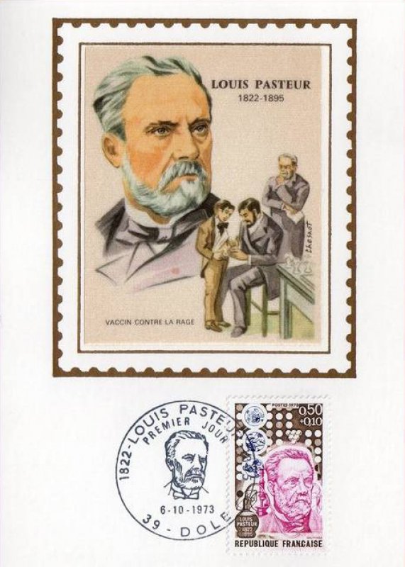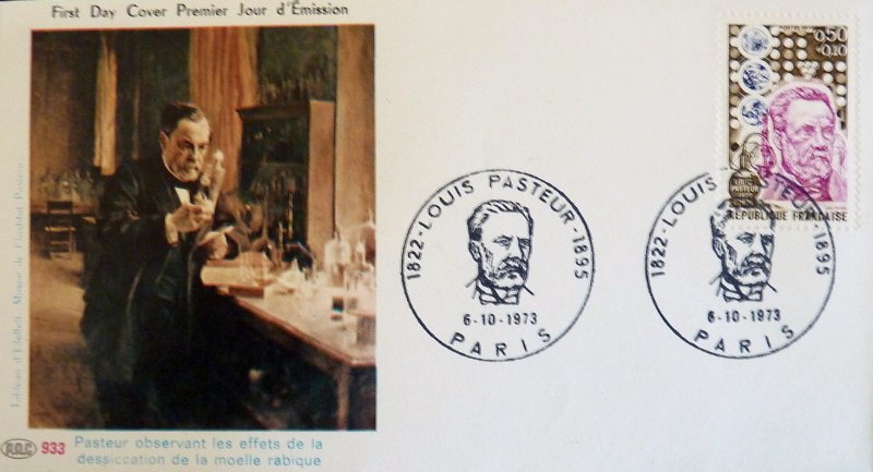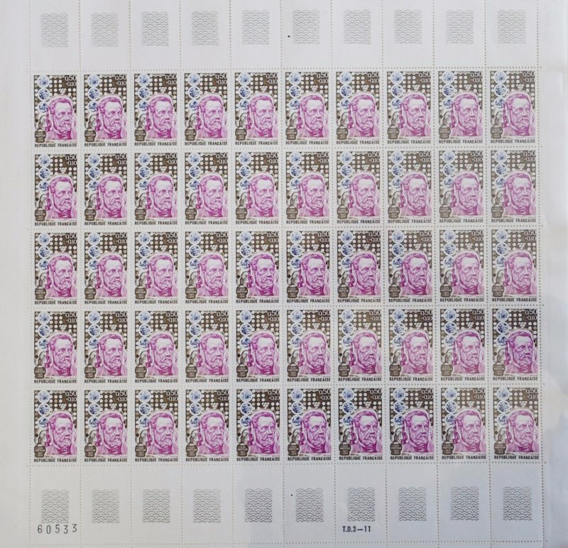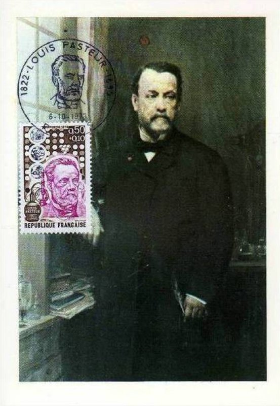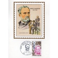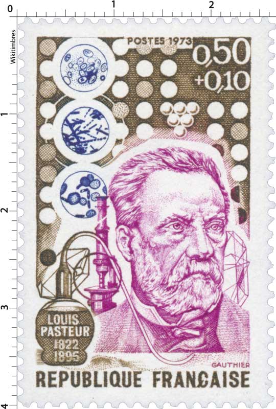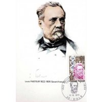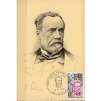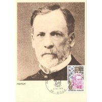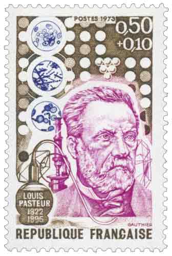 | Commentaire | Visuel : Louis Pasteur et une composition de son œuvre, dominant l'histoire des Sciences au cours du XIXe siècle. Les disques disposés en haut de la figurine évoquent la découverte qu'il fit alors du parallélisme existant entre la forme des cristaux, leur constitution moléculaire et leur action sur la lumière polarisée. / la découverte des fermentations, rappelées ici par une grappe de raisin, produit de l'activité de micro-organismes. / "Les générations dites spontanées": en observant des milieux putrescibles dans la cornue reproduite au premier plan, Pasteur prouve que tous les ferments proviennent de ferments déjà existants. / l'étude du charbon, dont le microscope dressé fait apercevoir le bacille à des stades différents de développement. En savoir plus sur Wikipédia: Louis Pasteur |