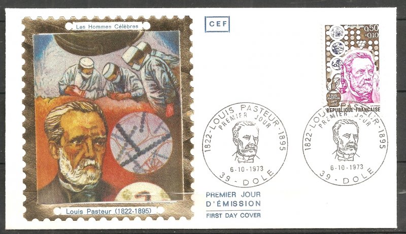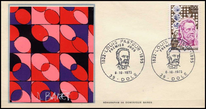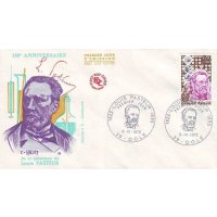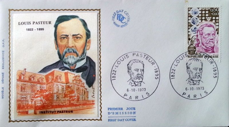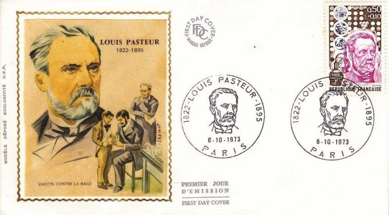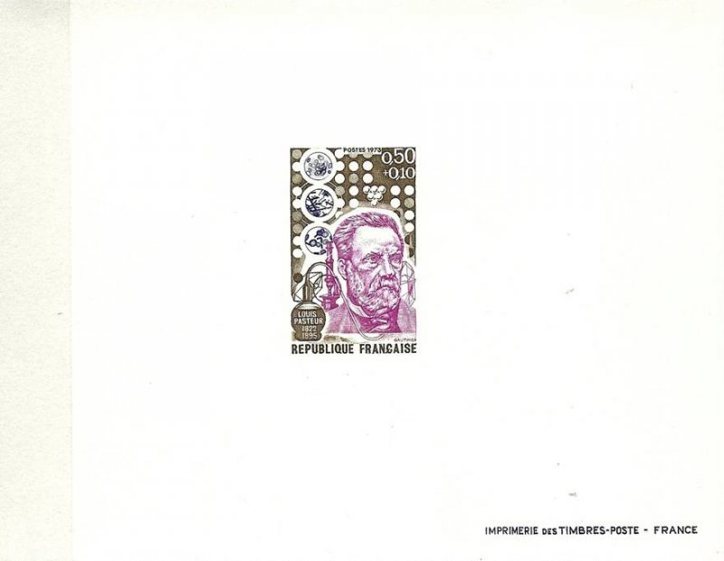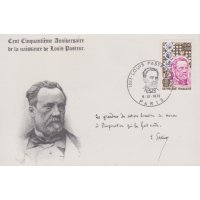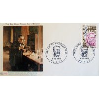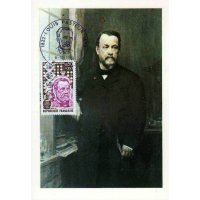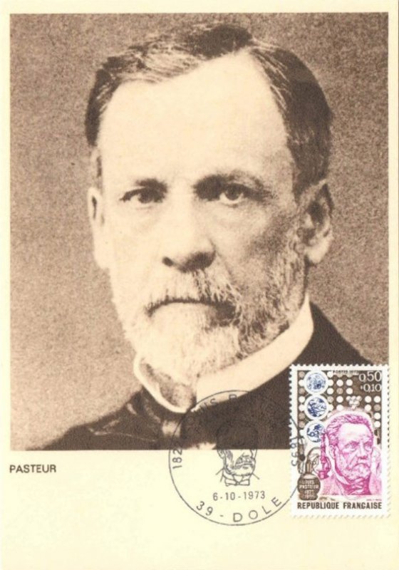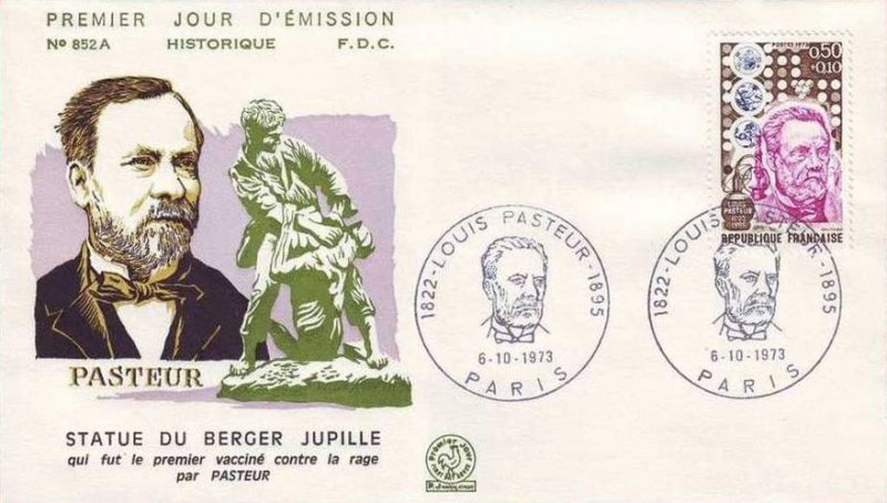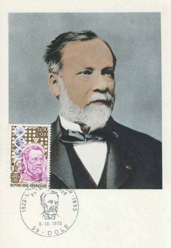 | Commentaire | Visuel : Louis Pasteur et une composition de son œuvre, dominant l'histoire des Sciences au cours du XIXe siècle. Les disques disposés en haut de la figurine évoquent la découverte qu'il fit alors du parallélisme existant entre la forme des cristaux, leur constitution moléculaire et leur action sur la lumière polarisée. / la découverte des fermentations, rappelées ici par une grappe de raisin, produit de l'activité de micro-organismes. / "Les générations dites spontanées": en observant des milieux putrescibles dans la cornue reproduite au premier plan, Pasteur prouve que tous les ferments proviennent de ferments déjà existants. / l'étude du charbon, dont le microscope dressé fait apercevoir le bacille à des stades différents de développement. En savoir plus sur Wikipédia: Louis Pasteur |