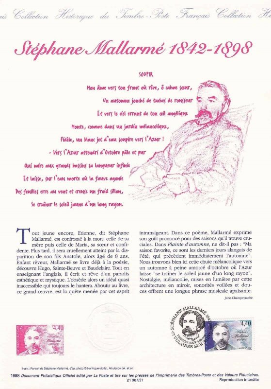 | Description | Centenaire de la disparition de Stéphane Mallarmé (1842-1898), poète, né à Paris et mort à Vulaines-sur-Seine |
