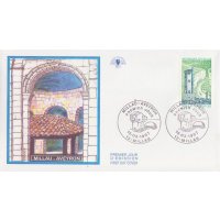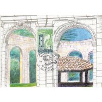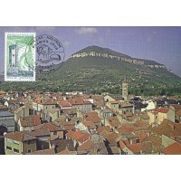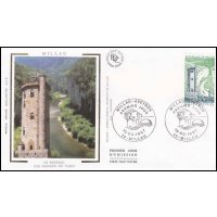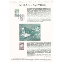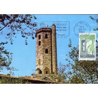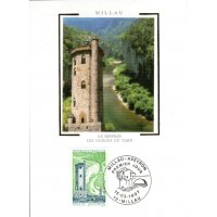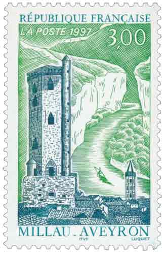 | Description | Millau (Aveyron), représentation du beffroi au-dessus des toits de la ville et d'un kayakiste qui navigue dans les gorges du Tarn |