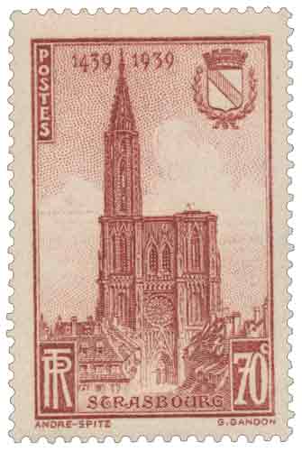 En savoir plus sur Wikipédia : Cathédrale Notre-Dame de Strasbourg Le timbre commémoratif à 70 centimes brun-rouge, dessiné par André Spitz et gravé par Gaston Gandon, représente la cathédrale Notre-Dame de Strasbourg avec sa flèche unique achevée en 1439 par Jean Hültz, marquant le cinq-centième anniversaire de cet édifice gothique emblématique qui fut l'ouvrage le plus élevé de la chrétienté jusqu'au XIXe siècle. Imprimé en taille-douce rotative par feuilles de 50, dentelé 13, il est mis en vente le 23 juin 1939 pour l'affranchissement des cartes postales et retiré le 5 octobre 1939, tiré à 4,2 millions d'exemplaires. |