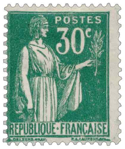 La typographie, qui tend parfois à simplifier les formes, est ici exploitée avec une maîtrise remarquable. Usage postal et durée de circulationLe tarif de 30 centimes correspond à plusieurs usages courants de l’époque, notamment certaines surtaxes ou compléments tarifaires. Le timbre reste en circulation jusqu’en novembre 1937, remplacé progressivement par d’autres valeurs du courant moderne. La durée de vie relativement courte de ce type (à peine quatre ans et demi) contribue à son intérêt philatélique, même si la valeur marchande demeure modeste en raison d’importants tirages cumulés. Place dans la série Paix