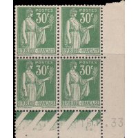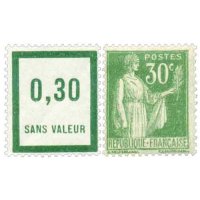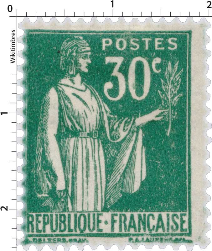 La typographie, qui tend parfois à simplifier les formes, est ici exploitée avec une maîtrise remarquable. Usage postal et durée de circulationLe tarif de 30 centimes correspond à plusieurs usages courants de l’époque, notamment certaines surtaxes ou compléments tarifaires. Le timbre reste en circulation jusqu’en novembre 1937, remplacé progressivement par d’autres valeurs du courant moderne. La durée de vie relativement courte de ce type (à peine quatre ans et demi) contribue à son intérêt philatélique, même si la valeur marchande demeure modeste en raison d’importants tirages cumulés. Place dans la série Paix