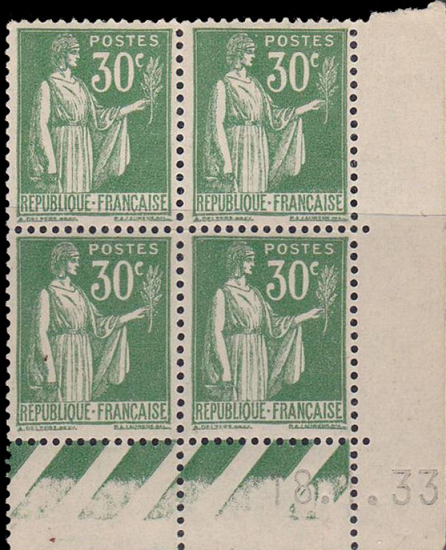 | Commentaire | L’émission du 30 centimes vert Type Paix, 2ᵉ série, en mars 1933, s’inscrit dans l’un des moments les plus révélateurs de la philatélie française de l’entre-deux-guerres. Au début des années 1930, l’État et l’administration postale cherchent à renouveler l’image des timbres d’usage courant, tout en y insufflant une symbolique forte, apte à répondre au climat politique d’alors : montée des tensions internationales, pacifisme populaire, instabilité gouvernementale et inquiétudes économiques. C’est dans ce contexte qu’André Tardieu, président du Conseil, demande la création d’une série entière consacrée à la Paix, un thème rarement traité dans la philatélie française avant cette date, et qui tranche radicalement avec les types Marianne, Semeuse ou Pasteur. Une allégorie fortement construite