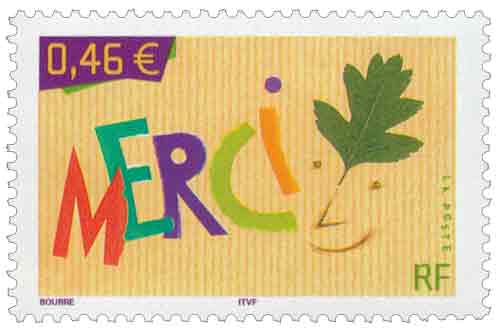 | Commentaire | Description synthétique du visuel du timbre : Ce timbre consiste en une composition inédite, mise en œuvre par le collage de matériaux divers (feuille d’arbre, papiers déchirés). Un MERCI animé, coloré, avenant et une évocation de l’humain original. Timbre sans millésime |
