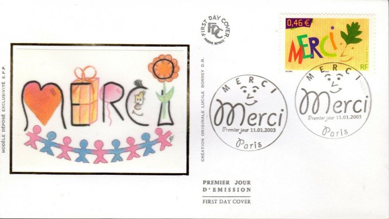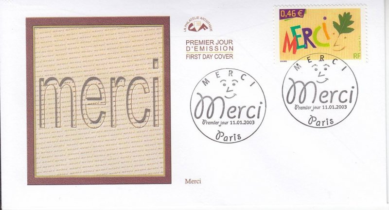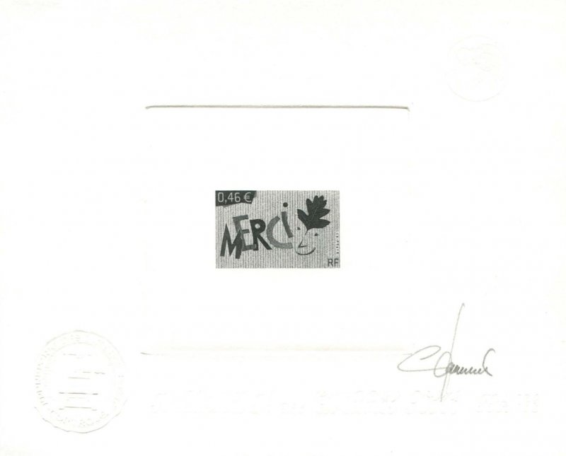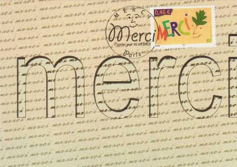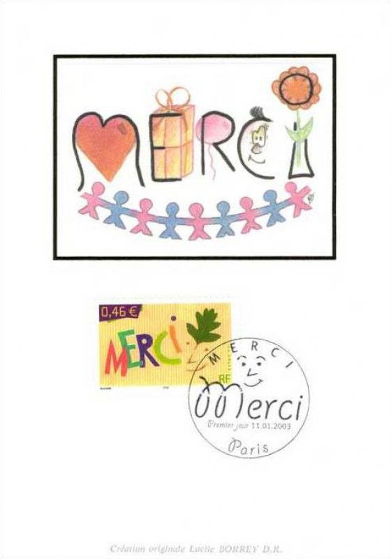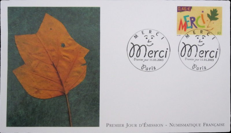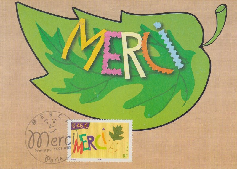 | Commentaire | Description synthétique du visuel du timbre : Ce timbre consiste en une composition inédite, mise en œuvre par le collage de matériaux divers (feuille d’arbre, papiers déchirés). Un MERCI animé, coloré, avenant et une évocation de l’humain original. Timbre sans millésime |
