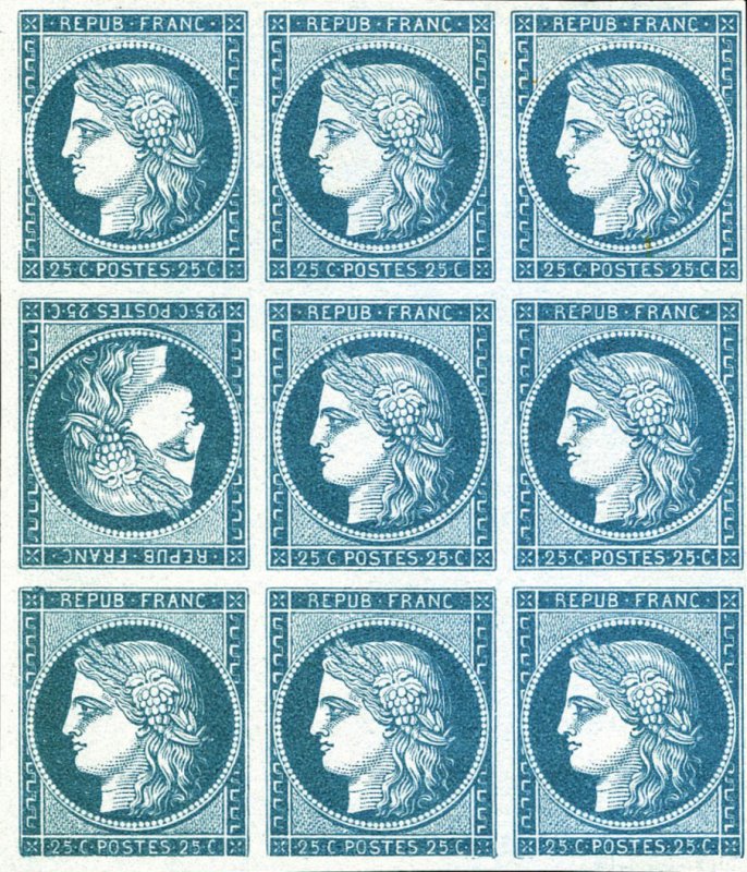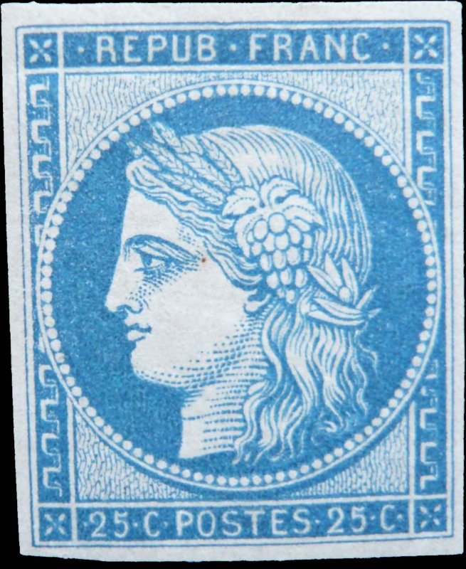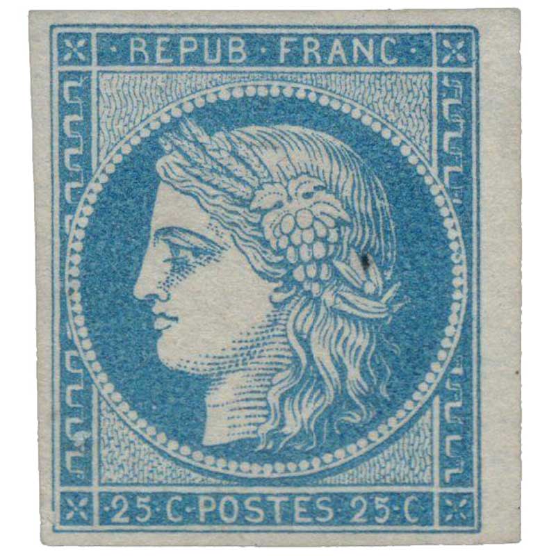 | Commentaire | Cérès - IIème République. Remplacé en septembre 1852 par un 25 centimes bleu au type président Louis-Napoléon Bonaparte Voir la vidéo "Histoires de timbres" En savoir plus sur Wikipédia : Cérès Émis le 1ᵉʳ juillet 1850, le 25 centimes bleu au type Cérès remplace le 20 centimes noir pour l’affranchissement des lettres de moins de 7,5 grammes circulant entre deux bureaux de direction, à la suite de la modification des tarifs interurbains prévue par la loi du 15 mai 1850. Cette nouvelle valeur s’inscrit dans la seconde série des timbres Cérès, complétant la réforme postale inaugurée en 1849 et visant à harmoniser les couleurs et les fonctions des affranchissements d’usage courant. Le timbre reprend l’effigie républicaine de Cérès, dessinée et gravée par Jacques-Jean Barre, et est imprimé en typographie à plat dans les ateliers de la Monnaie de Paris sous la direction d’Anatole Hulot. Les feuilles comportent 300 timbres, divisées en deux panneaux de 150 exemplaires (15 × 10). Le tirage dépasse 45 millions d’unités, contre 41 millions pour son prédécesseur noir. Un tête-bêche existe dans le second panneau d’impression, avec un nombre théorique estimé à 136 000 paires, bien que seules quelques pièces isolées soient connues, dont un exceptionnel bloc de quatre sur lettre. L’émission du 25 c bleu rend inutile le stock de 20 c bleu imprimé en avril 1849, détruit en juillet 1851. Le timbre est retiré en septembre 1852, remplacé par un 25 centimes de même couleur au type Président Louis-Napoléon Bonaparte. Plusieurs réimpressions ultérieures, notamment en 1862 et sous la IIIᵉ République, utilisent les mêmes planches, ce qui nécessite une expertise pour distinguer les tirages selon la couleur, l’impression et le papier. |