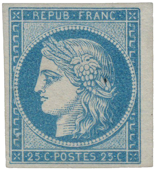| Commentaire | Cérès - IIème République. Remplacé en septembre 1852 par un 25 centimes bleu au type président Louis-Napoléon Bonaparte Voir la vidéo "Histoires de timbres" En savoir plus sur Wikipédia : Cérès Émis le 1ᵉʳ juillet 1850, le 25 centimes bleu au type Cérès remplace le 20 centimes noir pour l’affranchissement des lettres de moins de 7,5 grammes circulant entre deux bureaux de direction, à la suite de la modification des tarifs interurbains prévue par la loi du 15 mai 1850. Cette nouvelle valeur s’inscrit dans la seconde série des timbres Cérès, complétant la réforme postale inaugurée en 1849 et visant à harmoniser les couleurs et les fonctions des affranchissements d’usage courant. Le timbre reprend l’effigie républicaine de Cérès, dessinée et gravée par Jacques-Jean Barre, et est imprimé en typographie à plat dans les ateliers de la Monnaie de Paris sous la direction d’Anatole Hulot. Les feuilles comportent 300 timbres, divisées en deux panneaux de 150 exemplaires (15 × 10). Le tirage dépasse 42 millions d’unités, contre 41 millions pour son prédécesseur noir. Un tête-bêche existe dans le second panneau d’impression, avec un nombre théorique estimé à 136 000 paires, bien que seules quelques pièces isolées soient connues, dont un exceptionnel bloc de quatre sur lettre. L’émission du 25 c bleu rend inutile le stock de 20 c bleu imprimé en avril 1849, détruit en juillet 1851. Le timbre est retiré en juillet 1853, remplacé par un 25 centimes de même couleur au type Président Louis-Napoléon Bonaparte. Plusieurs réimpressions ultérieures, notamment en 1862 et sous la IIIᵉ République, utilisent les mêmes planches, ce qui nécessite une expertise pour distinguer les tirages selon la couleur, l’impression et le papier. |