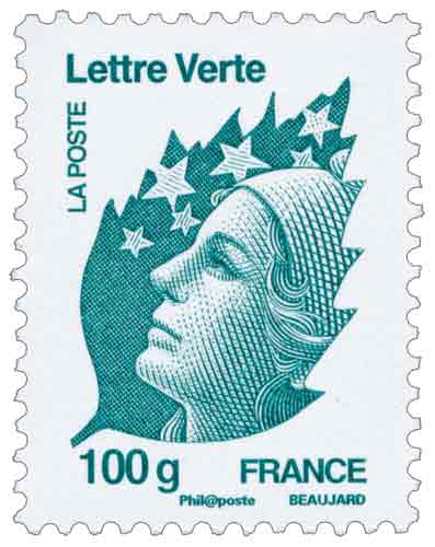 | Commentaire | Pour réduire son empreinte écologique, La Poste a lancé le 1er octobre 2011 une nouvelle offre de courrier rapide pour les particuliers et les entreprises, en J + 2. Ce nouveau service s'inscrit dans une optique de développement responsable, puisque le courrier n’est pas transporté par avion. Ce service plus économique (0,57 € pour le 20 g) est commercialisé avec un nouveau timbre “Lettre Verte” dont le visuel a été réalisé par Yves Beaujard d’après la Marianne et l’Europe. Le visage de Marianne s’inscrit dans une forme de feuille déclinée dans 4 versions de vert pour les 4 tarifs 20 g, 50 g, 100 g et 250 g.