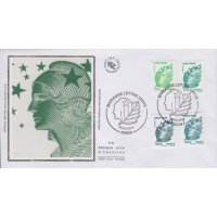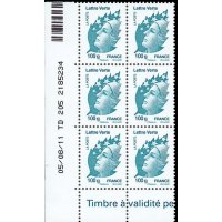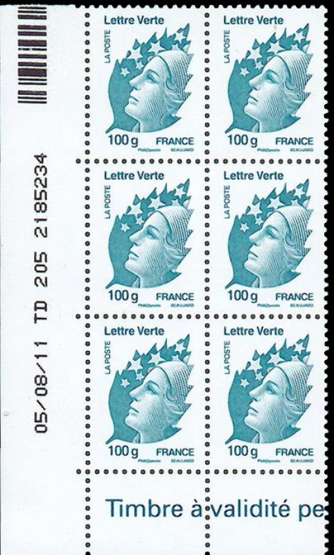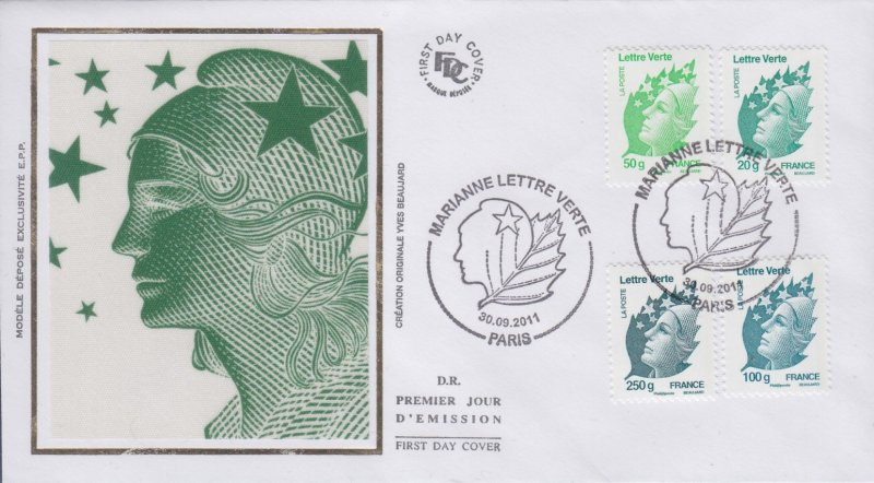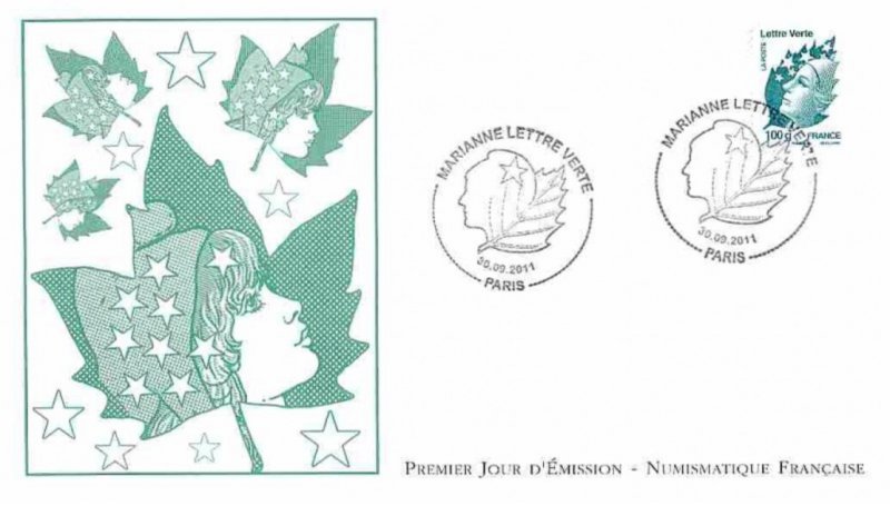 | Commentaire | Pour réduire son empreinte écologique, La Poste a lancé le 1er octobre 2011 une nouvelle offre de courrier rapide pour les particuliers et les entreprises, en J + 2. Ce nouveau service s'inscrit dans une optique de développement responsable, puisque le courrier n’est pas transporté par avion. Ce service plus économique (0,57 € pour le 20 g) est commercialisé avec un nouveau timbre “Lettre Verte” dont le visuel a été réalisé par Yves Beaujard d’après la Marianne et l’Europe. Le visage de Marianne s’inscrit dans une forme de feuille déclinée dans 4 versions de vert pour les 4 tarifs 20 g, 50 g, 100 g et 250 g.