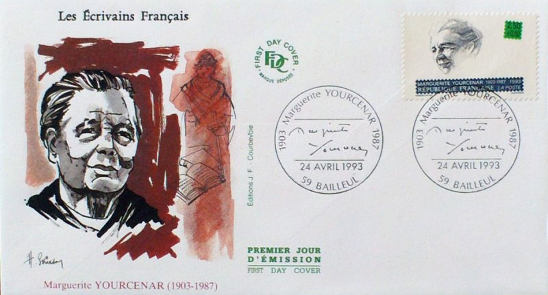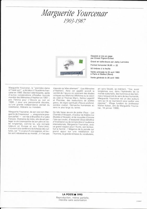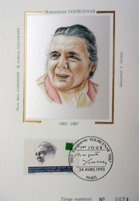 | Description | Marguerite Yourcenar (1903-1987), femme écrivain, née à Bruxelles (Première femme élue à l'Académie française en 1980) |