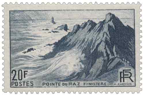 | Commentaire | Visuel : le phare de la Vieille, construit de 1882 à 1887 sur le rocher de Gorlebella, est situé entre la pointe du Raz et l'île de Sein. La mer d'Iroise, mer bordière baignant les côtes occidentales du Finistère, est une subdivision de la mer Celtique. Parsemée de récifs, animée par de forts courants de marée provenant d'étroites passes, elle est exposée à de fréquentes et intenses tempêtes hivernales. Émis en France en 1946, ce timbre gommé consacré à la Pointe du Raz s’inscrit dans la série des sites et monuments mettant en valeur les paysages emblématiques du territoire national, tout en répondant à des besoins d’affranchissement de forte valeur dans l’immédiat après-guerre. Dessiné et gravé en taille-douce par Henry Cheffer, il représente le spectaculaire promontoire rocheux du cap Sizun, dominé par les falaises granitiques faisant face à la mer d’Iroise, avec en arrière-plan le phare de la Vieille, édifié sur un écueil entre la pointe du Raz et l’île de Sein afin de sécuriser la navigation dans l’un des passages maritimes les plus redoutés de la côte bretonne. Mis en vente générale le 21 octobre 1946, ce timbre de 20 francs est destiné à l’affranchissement des lettres lourdes jusqu’à 1 000 g, ce qui explique son format horizontal, sa gravure détaillée et son tirage très élevé. Par cette émission, l’administration postale française associe fonction postale, qualité artistique et célébration d’un site naturel majeur, la Pointe du Raz occupant une place centrale dans l’imaginaire maritime et paysager de la Bretagne et de la France occidentale, au cœur du Finistère et de Pointe du Raz. |