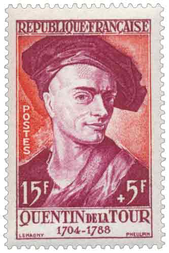 | Commentaire | Timbre grevé d'une surtaxe au profit de la Croix-Rouge française Visuel : Quentin de la Tour, autoportrait à la toque d'atelier (pastel sur papier bleu - V 31 x 39 cm - Musée Antoine-Lécuyer, Saint-Quentin) - Il fut le portraitiste officiel de l'aristocratie et de la famille royale sous le règne de Louis XV. Humaniste et ami des philosophes, il peignit Voltaire, Rousseau, d’Alembert. Émis en 1957 par la France dans une série de six timbres-poste consacrée à des personnages français célèbres et assortie d’une surtaxe au profit de la Croix-Rouge française, le timbre commémoratif dédié à Quentin de La Tour a été mis en vente à partir du 17 juin après une émission anticipée à Saint-Quentin, sa ville natale, et s’inscrit dans une politique philatélique mêlant hommage culturel et solidarité nationale ; gravé en taille-douce rotative au format vertical, il porte une valeur faciale de 15 francs majorée d’une surtaxe de 5 francs et répond à plusieurs usages postaux courants de l’année 1957, notamment l’affranchissement de la lettre simple et de certains imprimés, tout en s’intégrant à une série homogène par son format et sa technique d’impression ; le sujet met en lumière l’un des plus grands portraitistes du XVIIIᵉ siècle, maître incontesté du pastel, dont l’art novateur cherchait à restituer la psychologie des modèles, qu’il s’agisse de figures de la Cour, du monde littéraire ou du théâtre, et dont le célèbre portrait de Madame de Pompadour demeure emblématique, faisant de ce timbre un témoignage philatélique de l’excellence artistique française à l’époque des Lumières. |