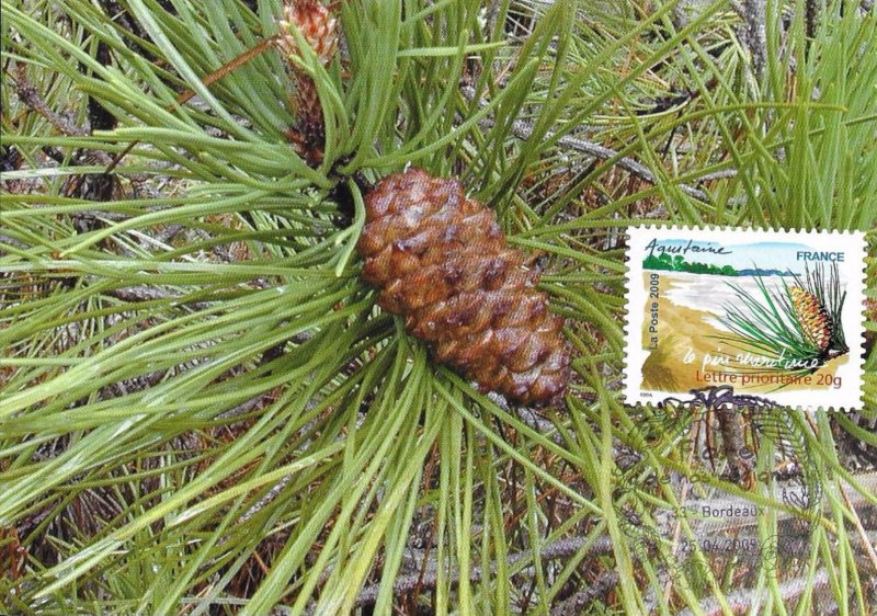 | Commentaire | Le pin maritime, pin des Landes, pin de Corte ou pin mésogéen (Pinus pinaster), est une espèce de conifères de la famille des pinacées. Il est parfois confondu avec le pin d'Alep ou le pin de Calabre. C'est un arbre qui peut atteindre 30 m de haut (en général de 20 à 30 m), qui arrive à maturité vers 40 ou 50 ans et qui peut vivre jusqu'à 500 ans. |