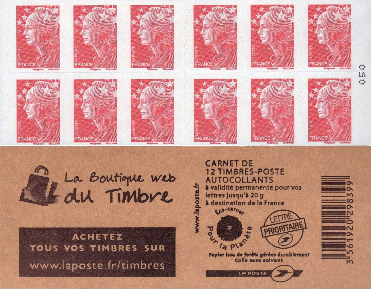 | Description | Carnet Marianne - Couverture “La Boutique Web du Timbre” 12 TP autocollants - Tarif lettre 20 g France |