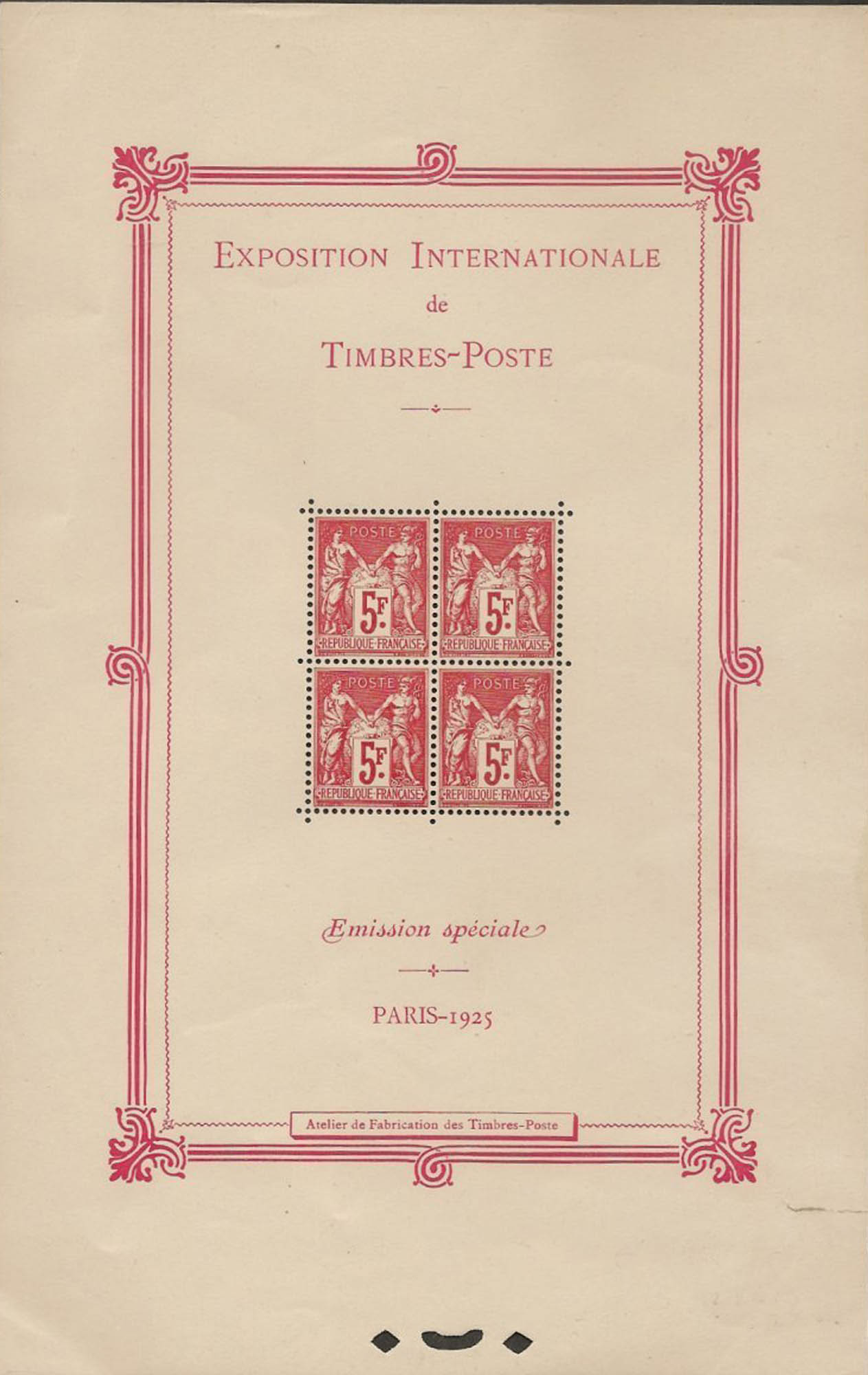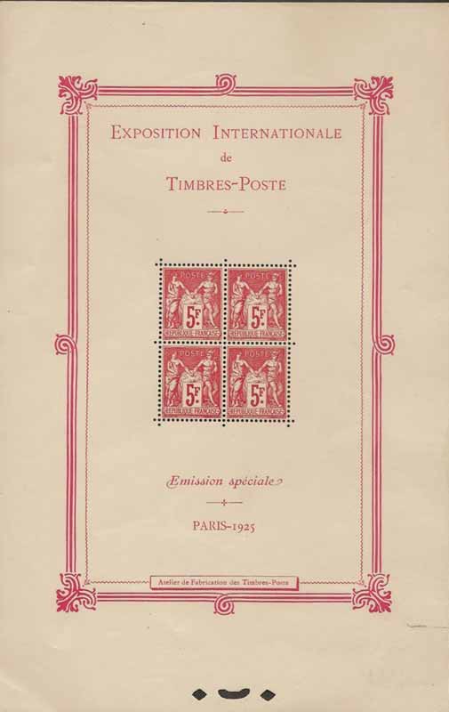 | Description | Exposition philatélique internationale de Paris. T.-P. imprimé par bloc de quatre sur feuillets de 140x220, avec cadre et EXPOSITION INTERNATIONALE DE TIMBRES-POSTE - Émission spéciale - PARIS - 1925 |
