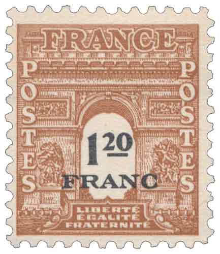 | Commentaire | Le timbre gommé de 1945 « Arc de Triomphe de Paris » à 1,20 franc brun et noir appartient à la 4ᵉ série du Gouvernement provisoire, mise en circulation afin de corriger l’inadéquation des valeurs faciales de la série de 1944 avec les tarifs postaux alors en vigueur. Émis le 12 février 1945, il correspond aux tarifs applicables au début de l’année et est destiné à l’affranchissement des cartes postales pour l’intérieur, usage nécessitant une valeur plus élevée dans le contexte inflationniste de l’après-Libération. Comme pour l’ensemble de cette série transitoire, la valeur faciale est imprimée en noir lors d’un second passage, procédé caractéristique visant à adapter rapidement les timbres existants aux nouvelles grilles tarifaires. Cette solution demeure toutefois de courte durée, les tarifs postaux étant modifiés à nouveau quelques semaines après la mise en vente, limitant l’utilisation effective de ces valeurs. Le choix iconographique de l’Arc de Triomphe, monument parisien emblématique et symbole de la mémoire nationale, répond à une volonté de continuité et de rassemblement dans la France de l’immédiat après-guerre. Le dessin est réalisé par William A. Roach d’après une photographie conservée à la bibliothèque municipale de Washington et la gravure est confiée à une équipe de graveurs américains, illustrant le contexte de coopération internationale propre à la période 1944-1945. |