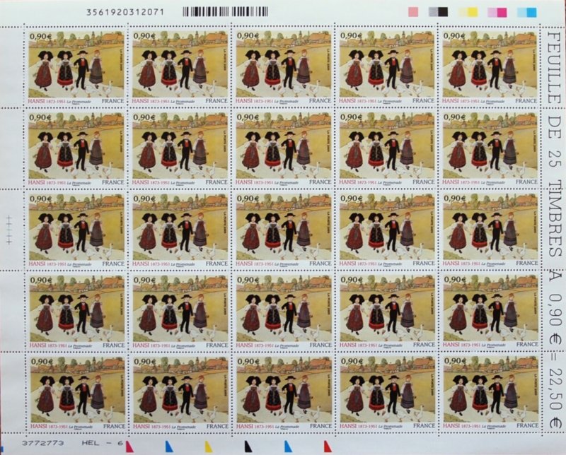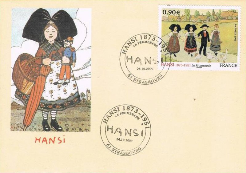 | Commentaire | Existe également sur papier gommé. La manifestation premier jour a lieu les 24 et 25 octobre à Colmar, ville natale de l'artiste, ainsi que le 24 à Strasbourg et Vougeot. Le timbre à date de Baras reproduit la signature d'Hansi , sur ce cachet, la mention « premier jour » |