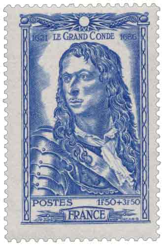 | Commentaire | Timbre gommé de France émis en 1944, ce timbre commémoratif est consacré à Le Grand Condé, figure militaire majeure du XVIIᵉ siècle, représenté dans une gravure d’Albert Decaris, et s’inscrit dans les émissions de juillet 1944 dédiées aux grandes figures de l’histoire française, en lien avec les timbres commémorant le règne de Louis XIV. Son émission intervient dans un contexte postal marqué par la présence systématique de surtaxes au profit du Secours National, caractéristique des dernières émissions de l’Occupation, et son usage correspond à l’affranchissement de la lettre simple pour le régime intérieur. Le choix du Grand Condé renvoie à sa place centrale dans l’histoire militaire française, notamment sa victoire décisive à Rocroi en 1643, épisode fondateur de son prestige, unanimement reconnu par l’historiographie, ainsi qu’à son parcours complexe au service successif de Louis XIII puis de Louis XIV, après sa disgrâce liée à la Fronde et son retour en grâce consécutif au traité des Pyrénées, éléments qui expliquent sa présence dans une série valorisant les grandes figures du pouvoir et de l’État monarchique. |
