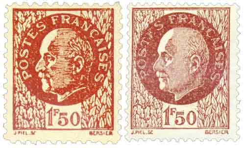 | Description | Maréchal Pétain - type Bersier, faux Pétain émis en feuille de 96 TP en février 1944 par la Résistance ( Le faux est à gauche, le vrai timbre est à droite) |