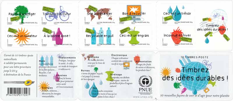 | Commentaire | Le Programme des Nations Unies pour l’environnement (PNUE) et La Poste s’associent pour émettre en juin 2008 un carnet de 10 timbres-poste autoadhésifs ayant pour thème la sauvegarde de l’environnement et le développement durable. 10 thèmes sont illustrés |