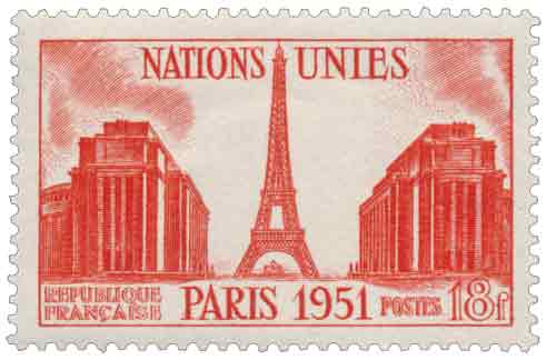 | Commentaire | Mis en vente en France à partir du 6 novembre 1951, les deux timbres-poste commémoratifs de la réunion à Paris de l’Assemblée générale des Nations Unies marquent la seconde tenue de cette institution internationale dans la capitale française. Émis simultanément en deux valeurs faciales, 18 francs rouge et 30 francs bleu, ces timbres de format horizontal sont dessinés et gravés en taille-douce par Decaris, technique de prédilection pour les émissions commémoratives de prestige au début des années 1950. Le motif met en avant le Palais de Chaillot, siège provisoire de l’Assemblée générale, édifice emblématique du Paris du XXᵉ siècle et symbole du rôle diplomatique de la France dans les relations internationales d’après-guerre. Cette émission s’inscrit dans une série de timbres français consacrés aux grandes organisations et événements internationaux, utilisant le timbre comme vecteur de message politique et culturel, en l’occurrence la promotion de la paix et de la coopération internationale incarnées par l’Organisation des Nations Unies. |