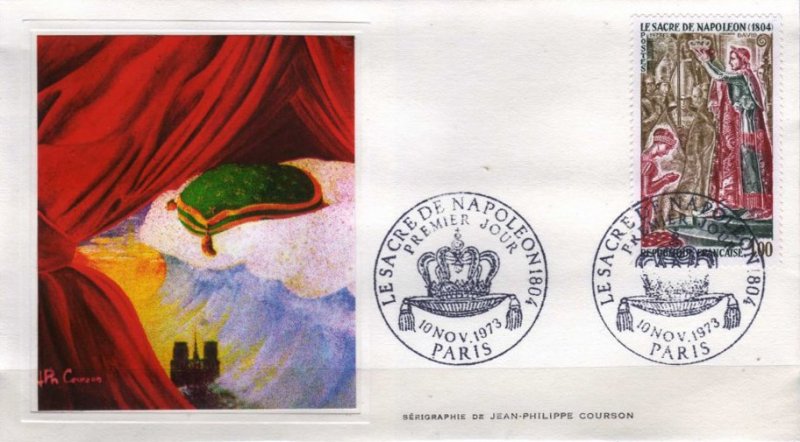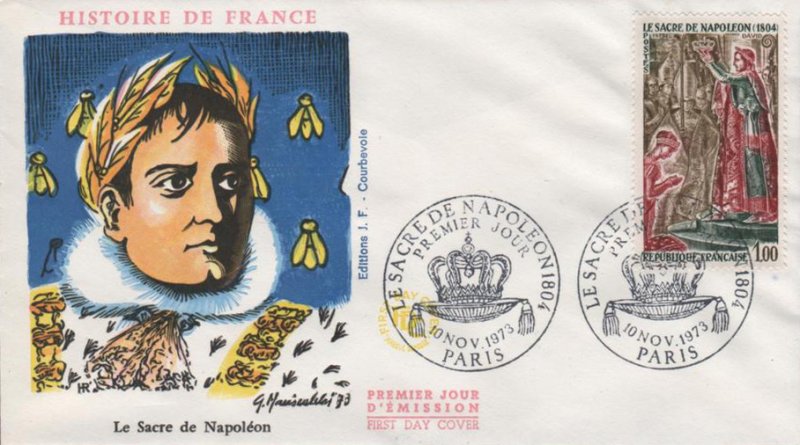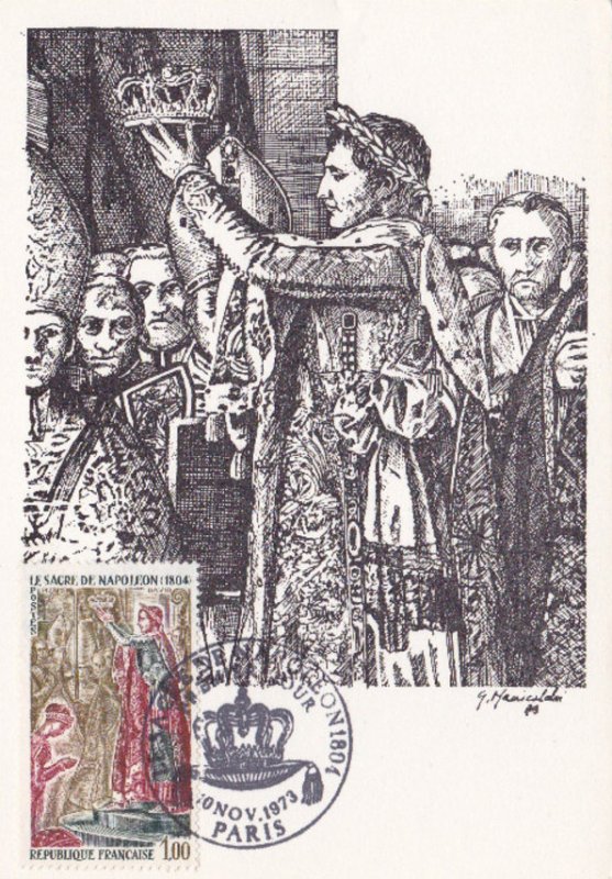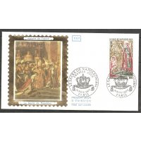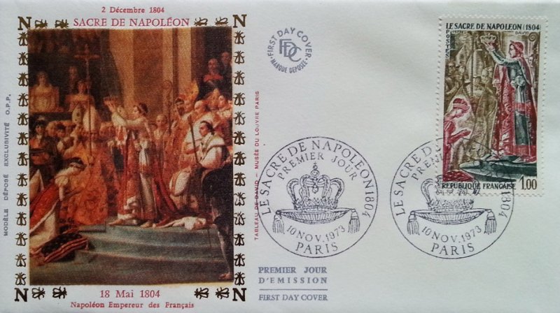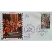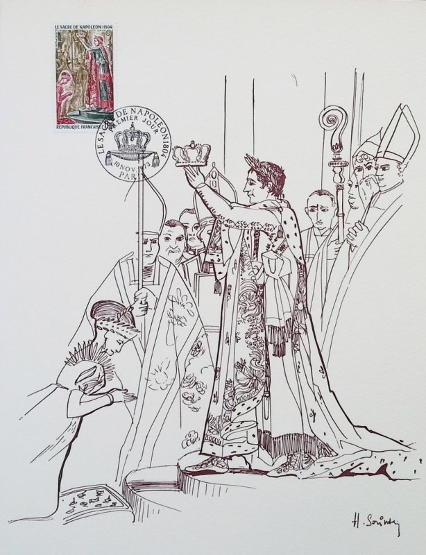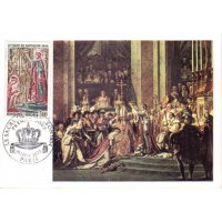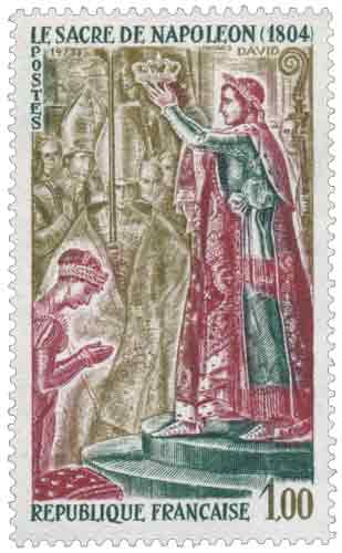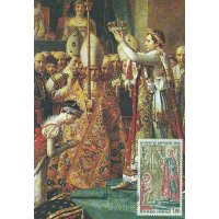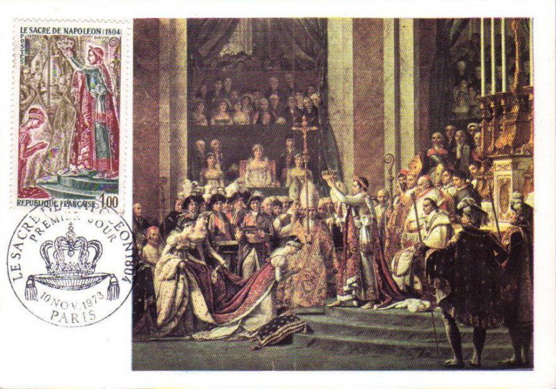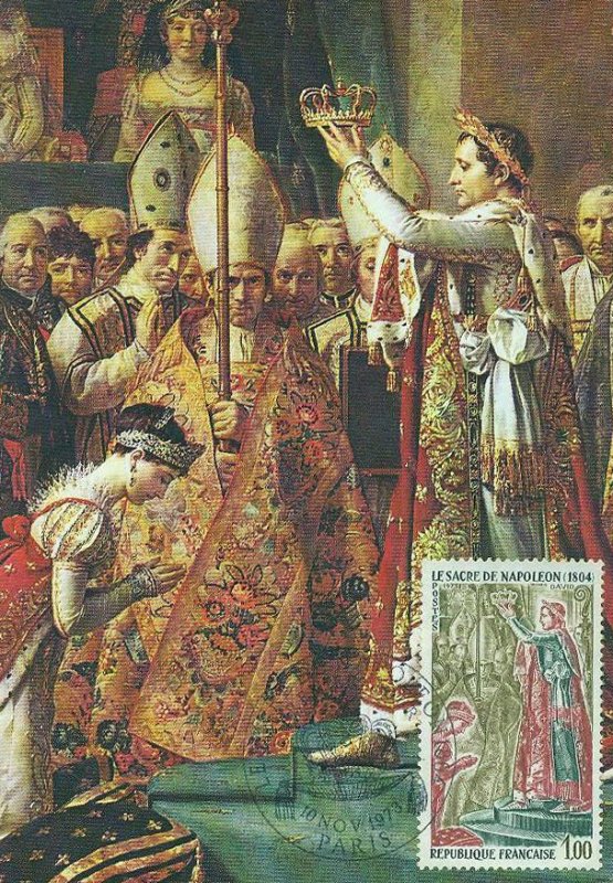 | Commentaire | Visuel : le sacre de Napoléon Ier est la cérémonie d’intronisation et de couronnement, qui suivit la proclamation de Napoléon Bonaparte comme empereur des Français, sous le titre de Napoléon 1er du 18 mai 1804. La cérémonie religieuse du sacre, par le pape Pie VII, suivie de celle du couronnement, se déroula, le 2 déc.1804, dans la cathédrale Notre-Dame de Paris. le peintre Jacques Louis DAVID (1748-1825, peintre, Conventionnel et Académicien) choisit la scène du couronnement de l'impératrice Joséphine de Beauharnais (1763-1814) par l'empereur Napoléon 1er, qui après s'être couronné lui-même, impose de ses propres mains le diadème à Joséphine, devant le pape Pie VII, le 2 déc.1804 à Notre-Dame de Paris. (une scène partielle du tableau de 1806/07 - huile sur toile - H 9,79 m x 6,21 m). |